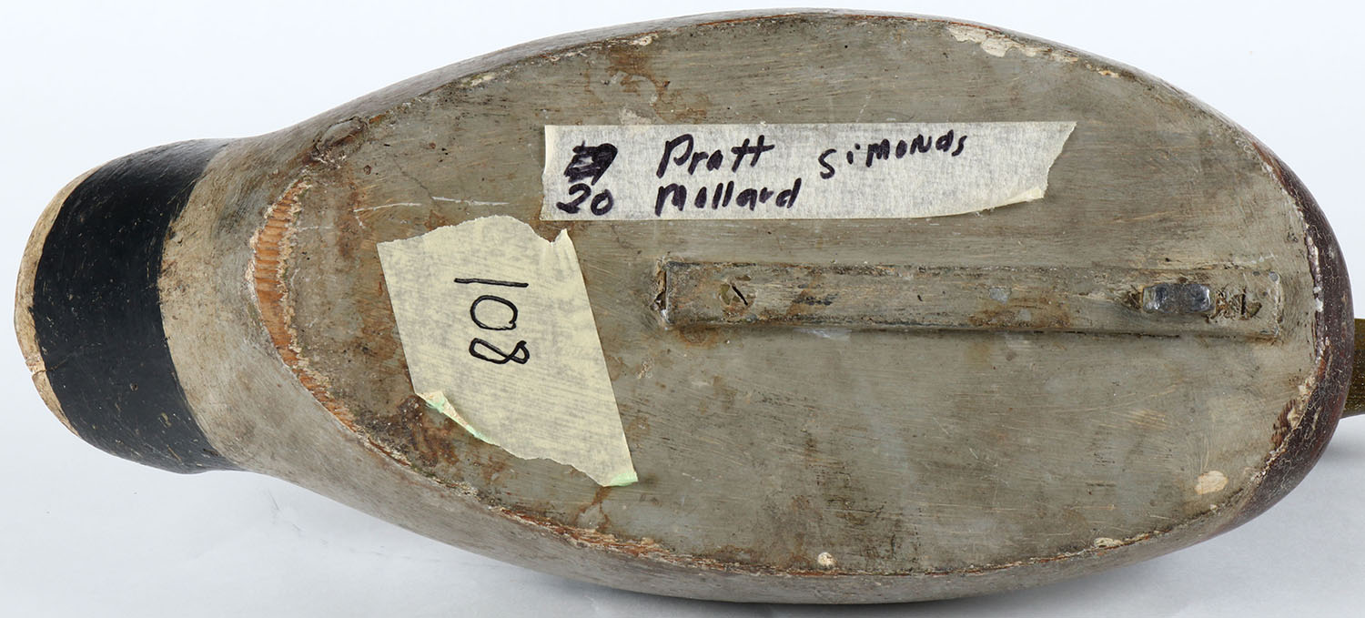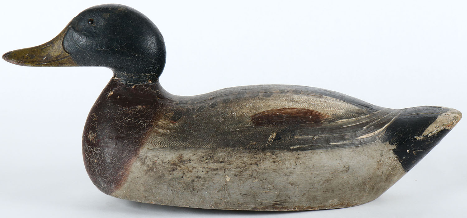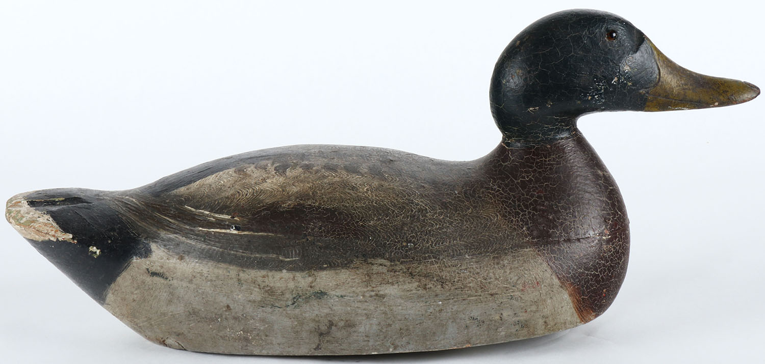 Premier Mallard Drake by Mason Decoy Company, Detroit, MI, 1896-1924 glass eyes, hollow, old repaint by Illinois River classic carver Henry Holmes, age crack on back and tail chip. Grade: Very Good - Value: 100 to 200