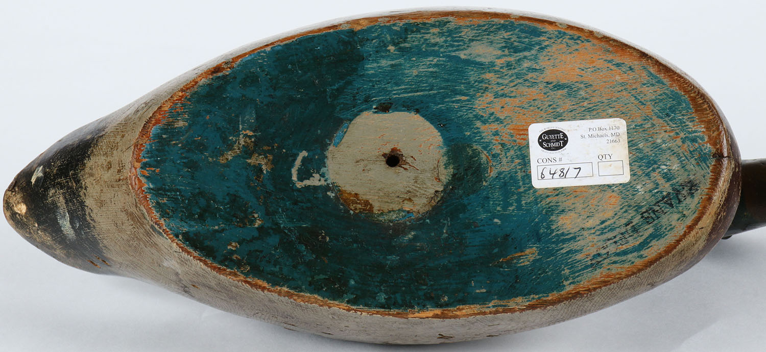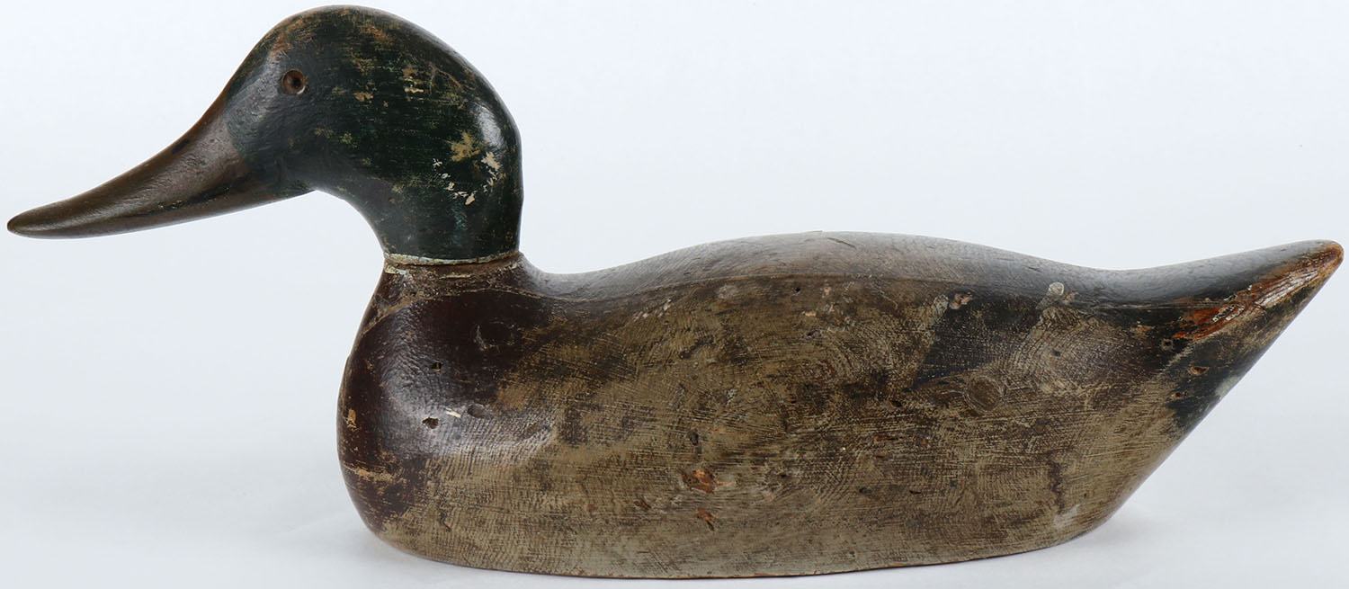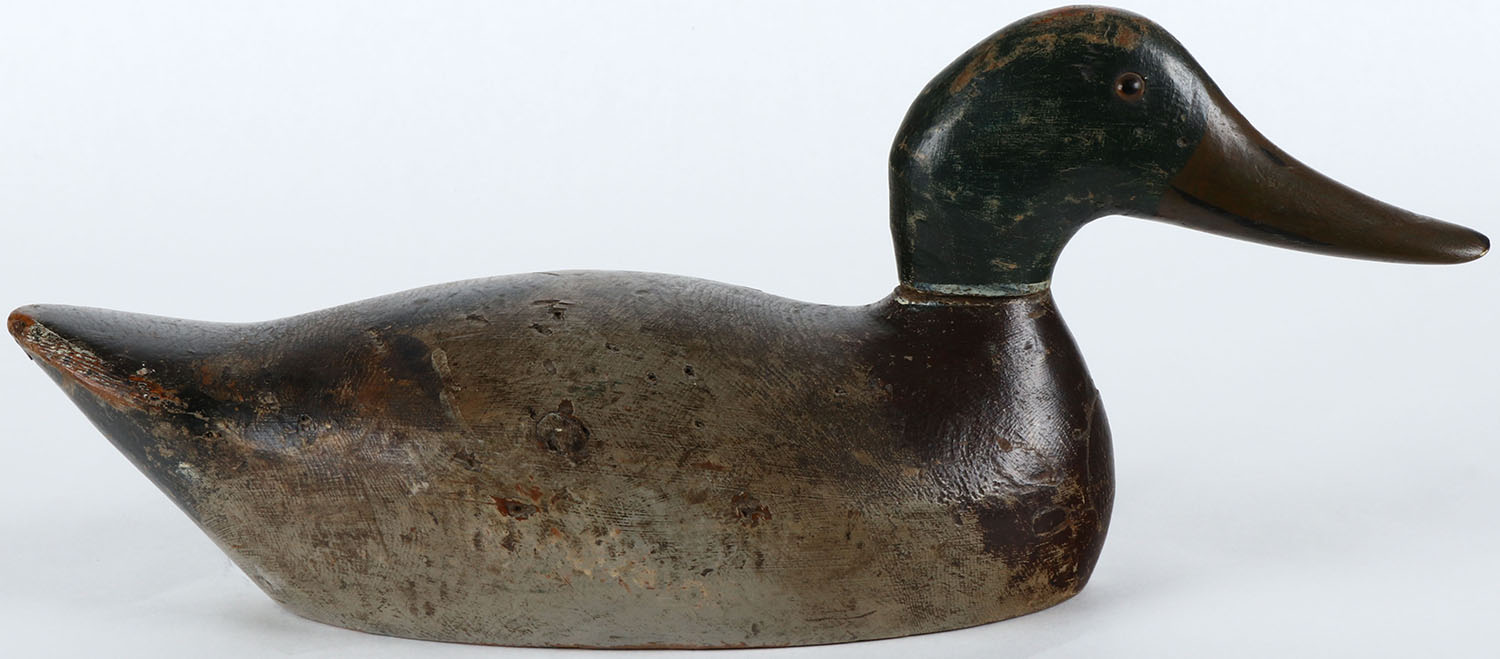 Standard Grade Mallard Drake by Evans Decoy Factory, Ladysmith, WI, 1927 - 1934, glass eyes, solid wood, worn original paint (except on the bottom) with typical wear, structurally excellent. Grade: Very Good - Value: 100 to 200