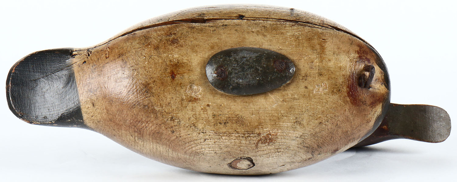 Late Standard Redhead Drake by Mason Decoy Company, Detroit, MI, 1896-1924. Glass eyes, solid wood, strong original paint with an original Mason weight, has age crack on bottom. Grade: Very Good - Value: 60 to 120