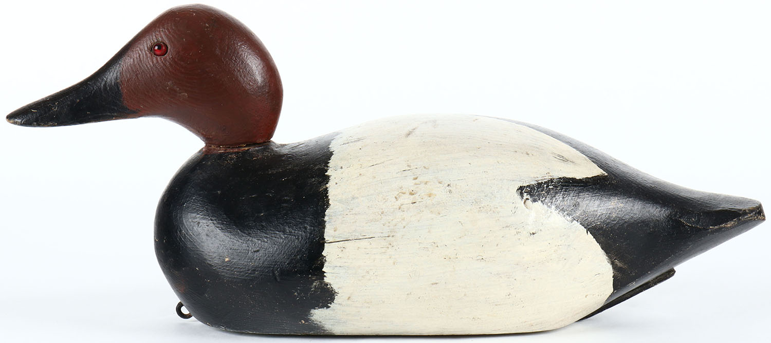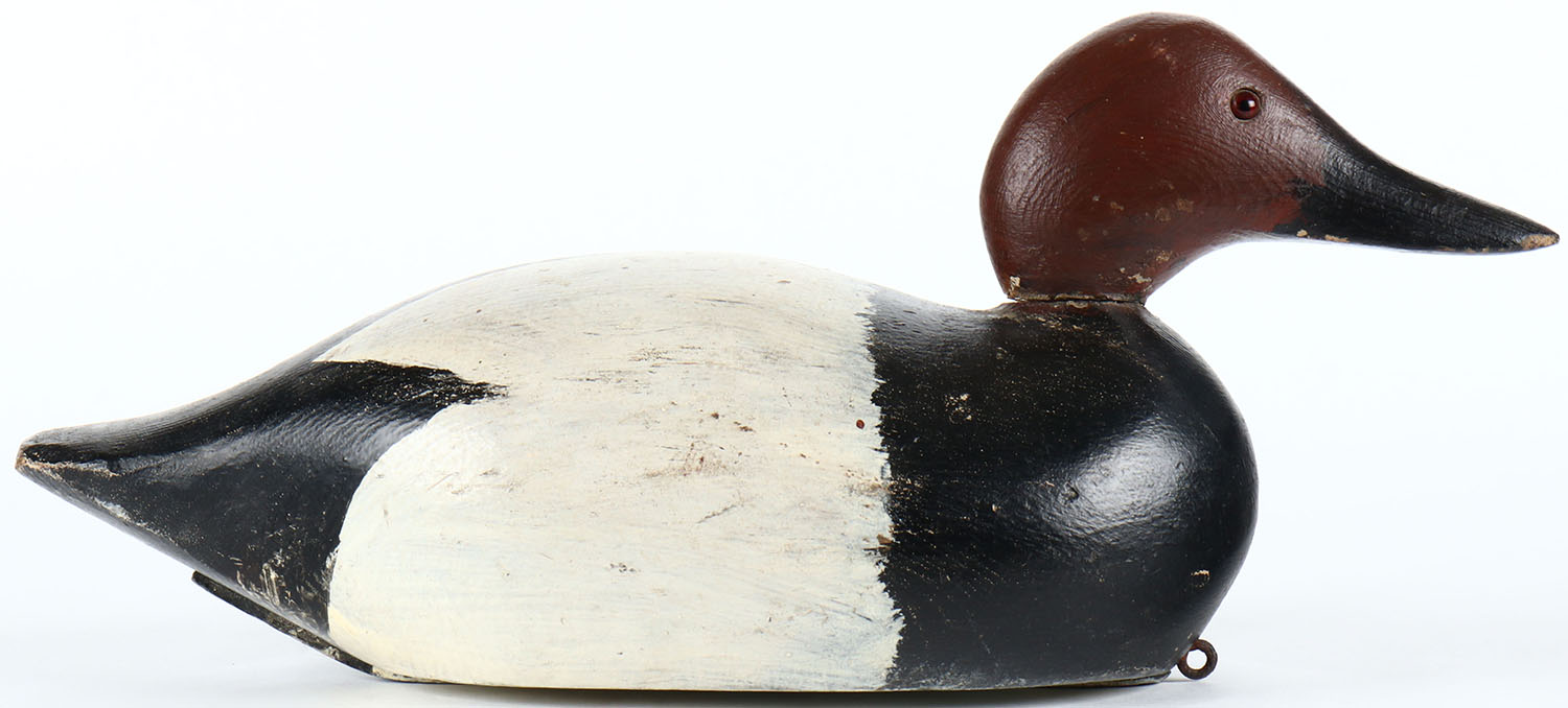 Factory Canvasback Drake, glass eyes, solid wood, apparent Mason head on a Pratt body with complete paint restoration on the body. structurally excellent. Grade: Excellent - Value: 40 to 75