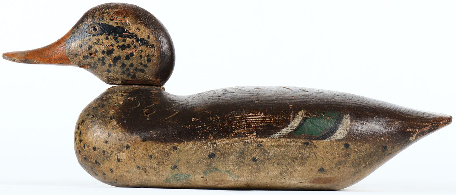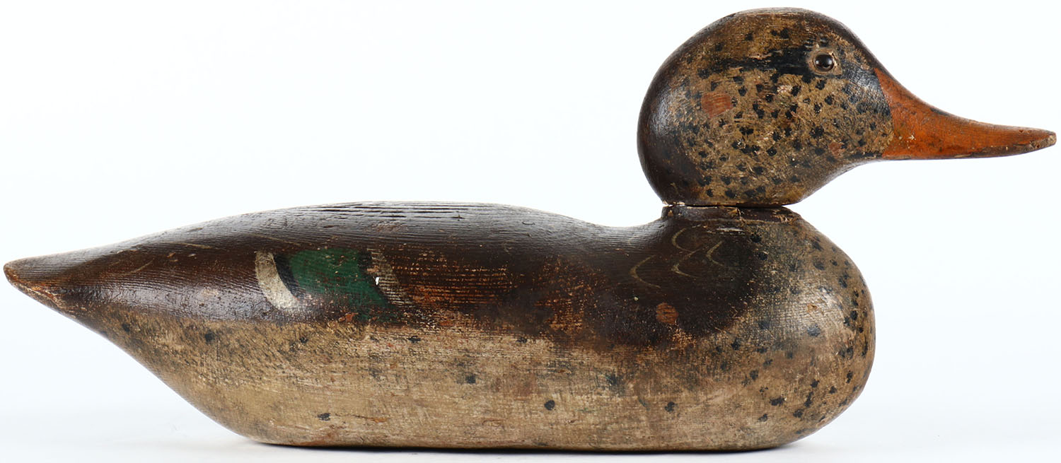 Standard Mallard Hen by Mason Decoy Company, Detroit, MI, 1896-1924. Glass eyes, solid Wood, all original paint with wear, head is slightly loose. Grade: Very Good - Value: 80 to 150