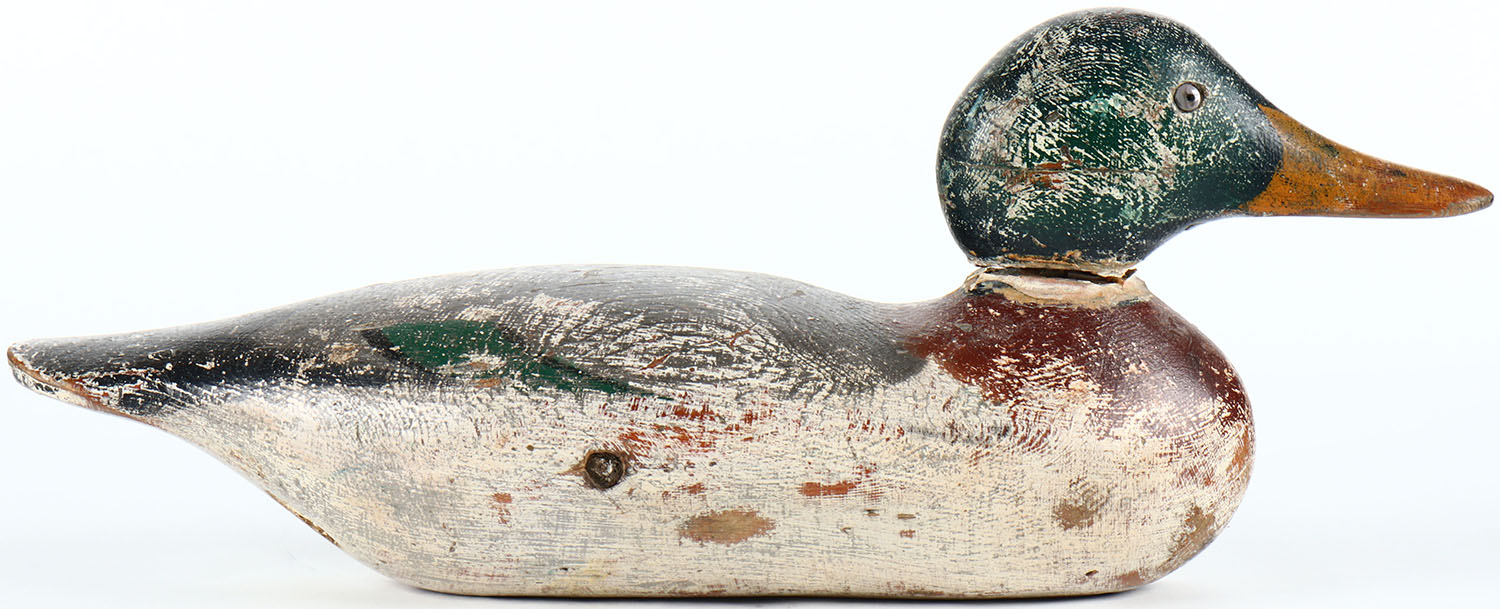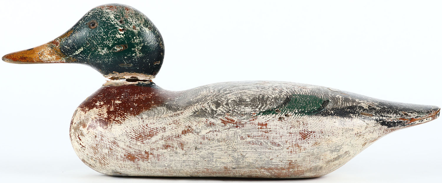 Standard Mallard Drake by Mason Decoy Company, Detroit, MI, 1896-1924. Glass eyes, solid wood, original paint with much wear. Grade: Very Good - Value: 60 to 120