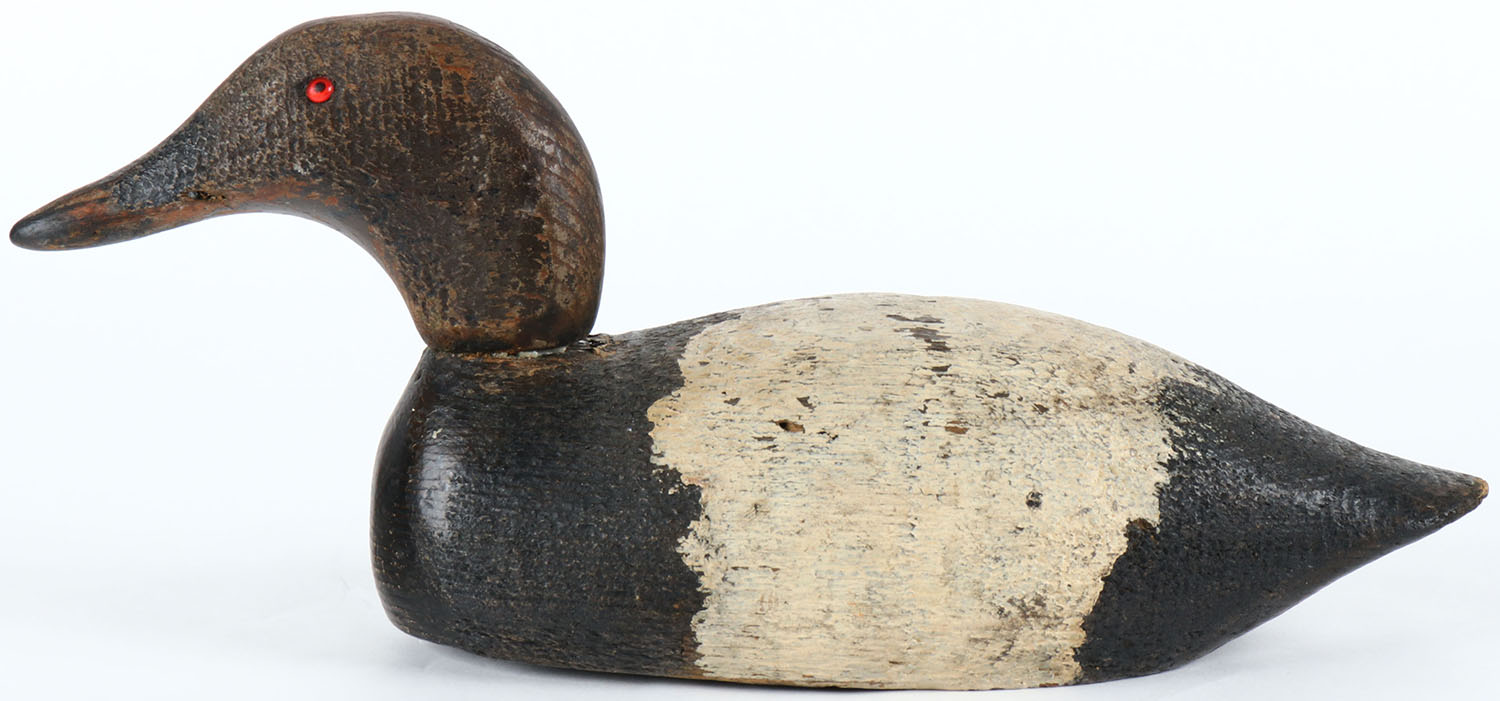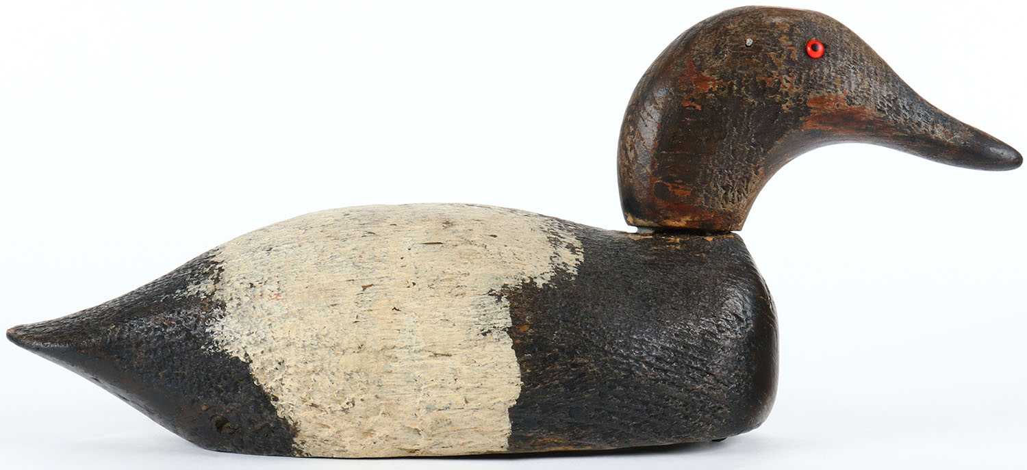Canvasback Drake by unknown factory. Glass eyes, hollow wood, old hunter repaint, structurally excellent. Grade: Excellent - Value: 40 to 80