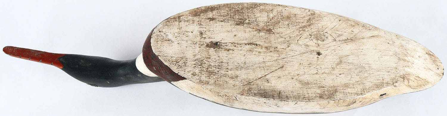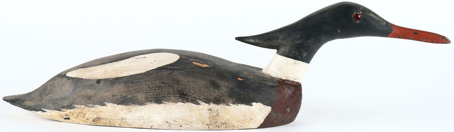 Swimming Hooded Merganser by unknown maker, glass eyes, solid wood, original paint, structurally excellent. Grade: Excellent - Value: 26 to 50
