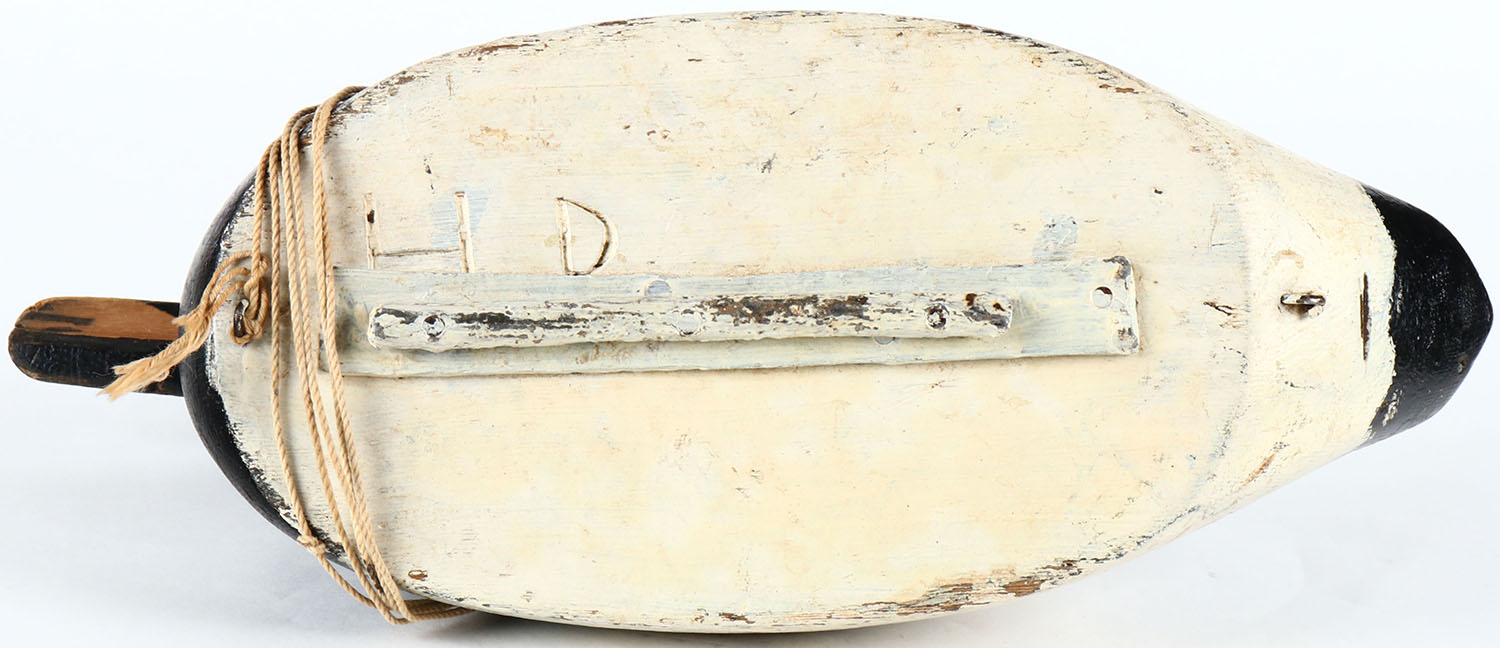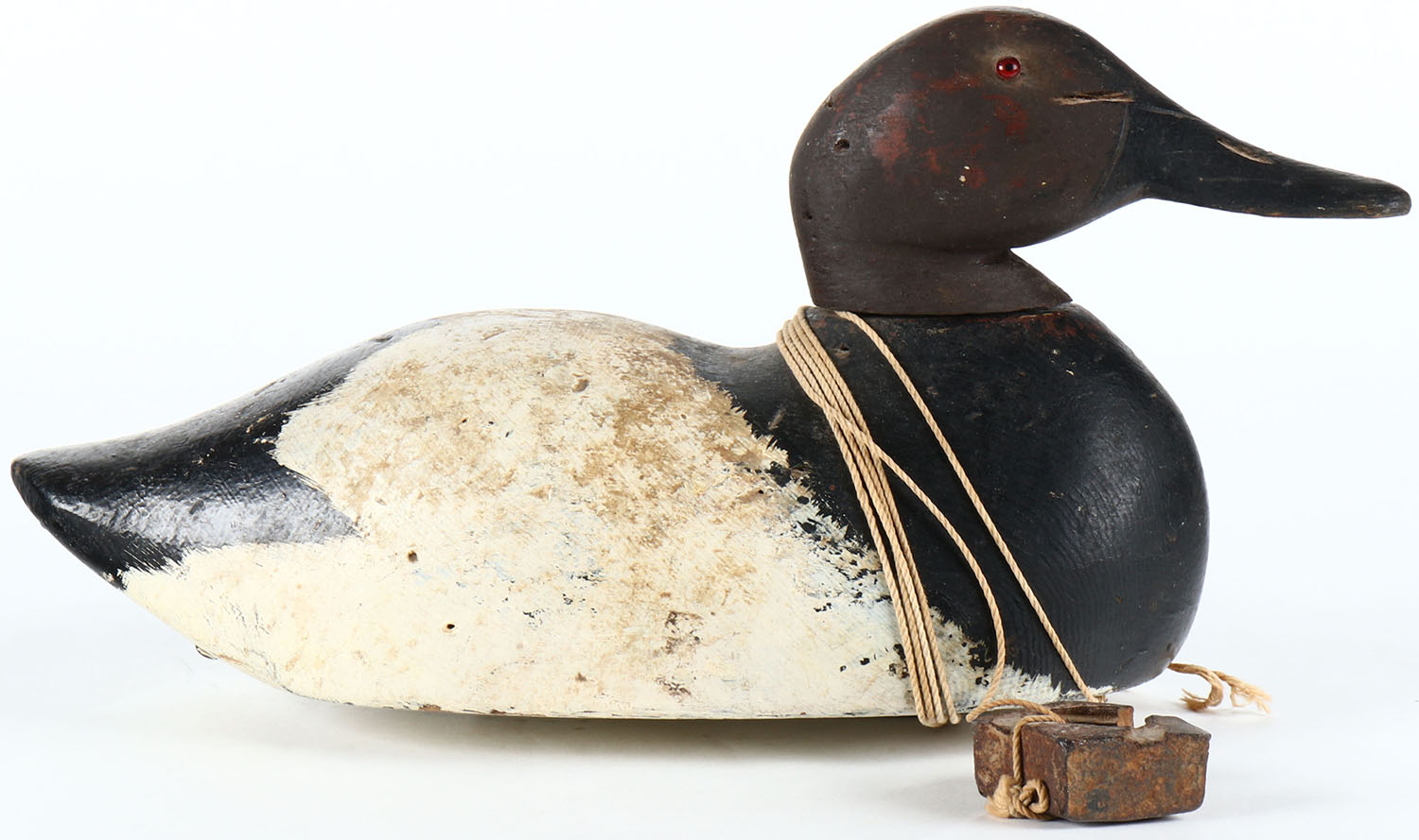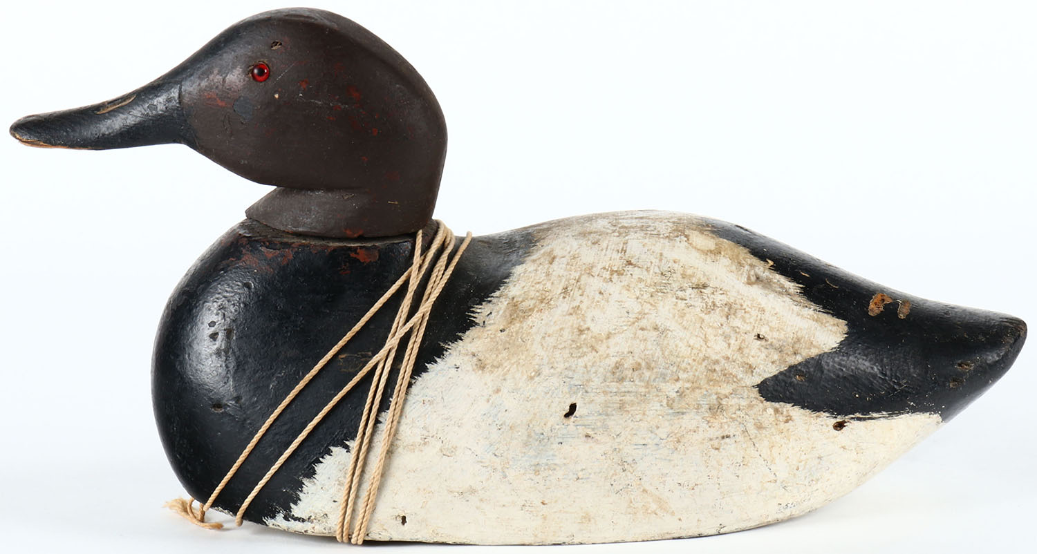Canvasback Drake by unknown maker, glass eyes, solid wood, original paint, head comes completely off. Grade: Very Good ++ - Value: 26 to 50