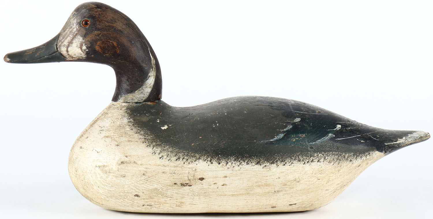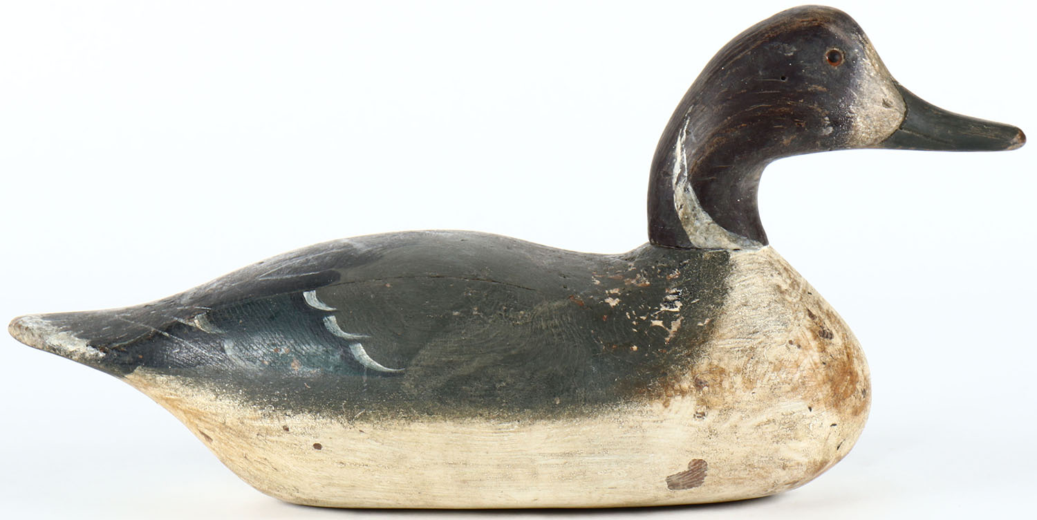Challenge Pintail Drake by Mason Decoy Company, Detroit, MI, 1896-1924. Glass eyes, solid wood, complete paint restoration with a head not original to the body, age cracks on back and on bottom. Grade: Very Good - Value: 70 to 150