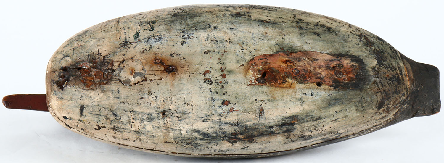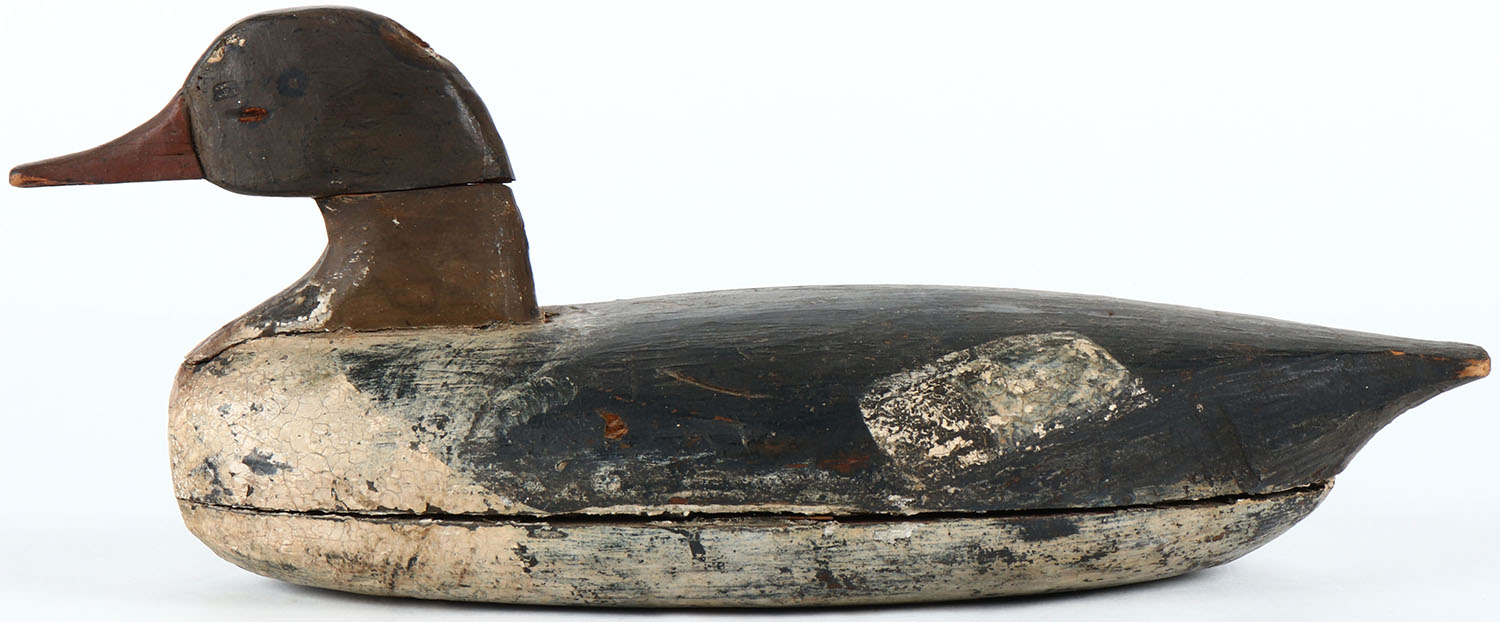 Merganser by unknown maker, painted eyes, solid wood, combination of some original paint and old working repaint, neck crack, body seam separation. Grade: Very Good - Value: 80 to 150