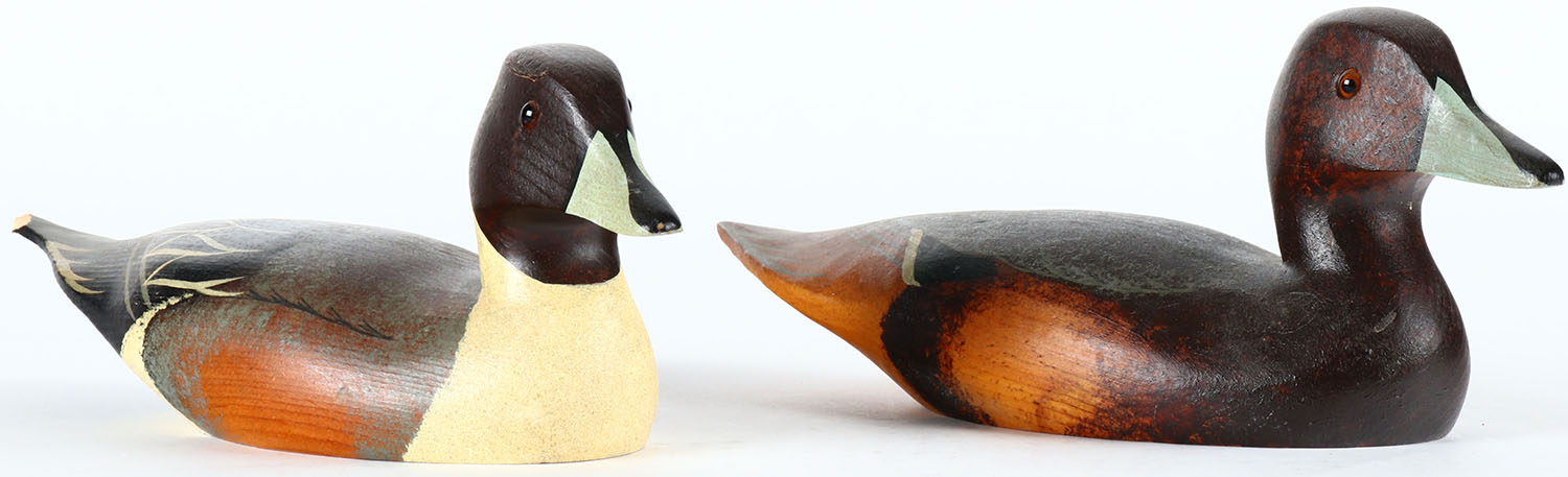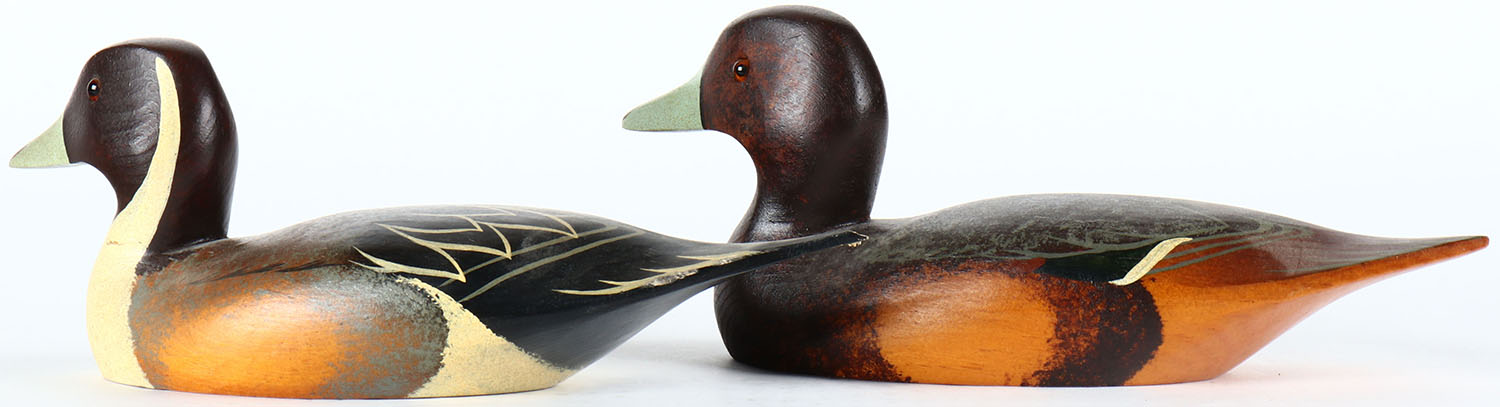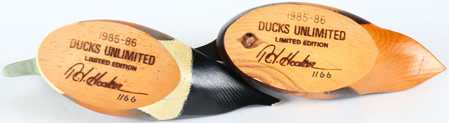 Pair of Miniature Pintails by T.J. Hooker, glass eyes, solid wood, original paint, tail is chipping on the drake, braded by DUCKS UNLIMITED PT. HOOKER on bottom. Grade: Very Good