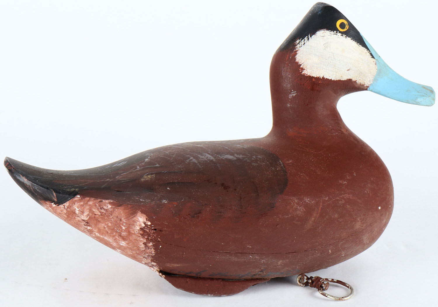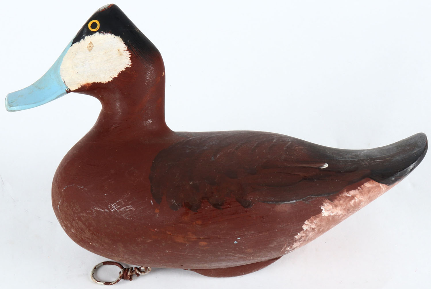 Ruddy Duck Drake by Harry Jobes, Harve De Grace, MD. Painted eyes, solid wood, original paint, structurally excellent, signed by HARRY JOBES on bottom. Grade: Excellent + - Value: 50 to 100
