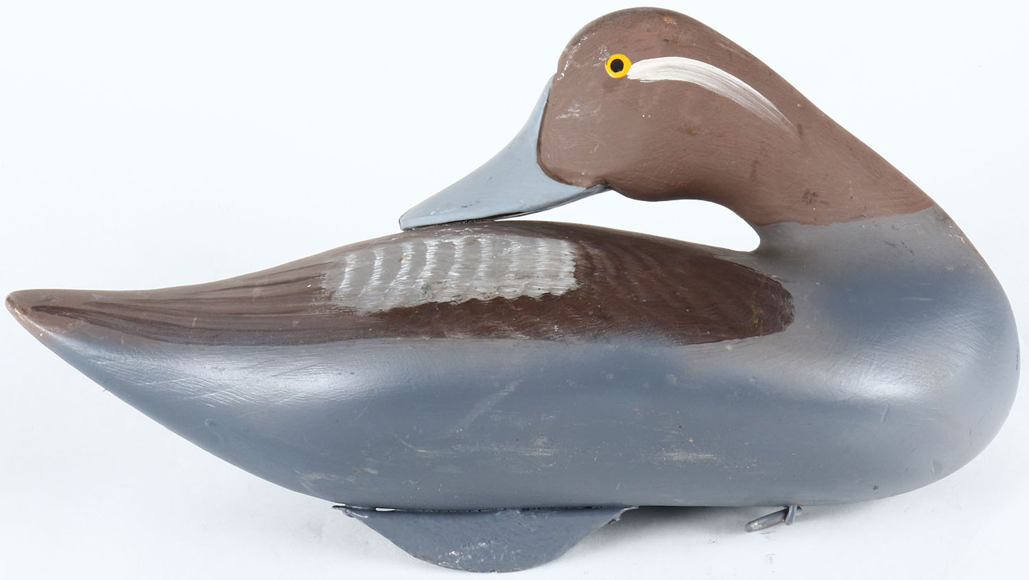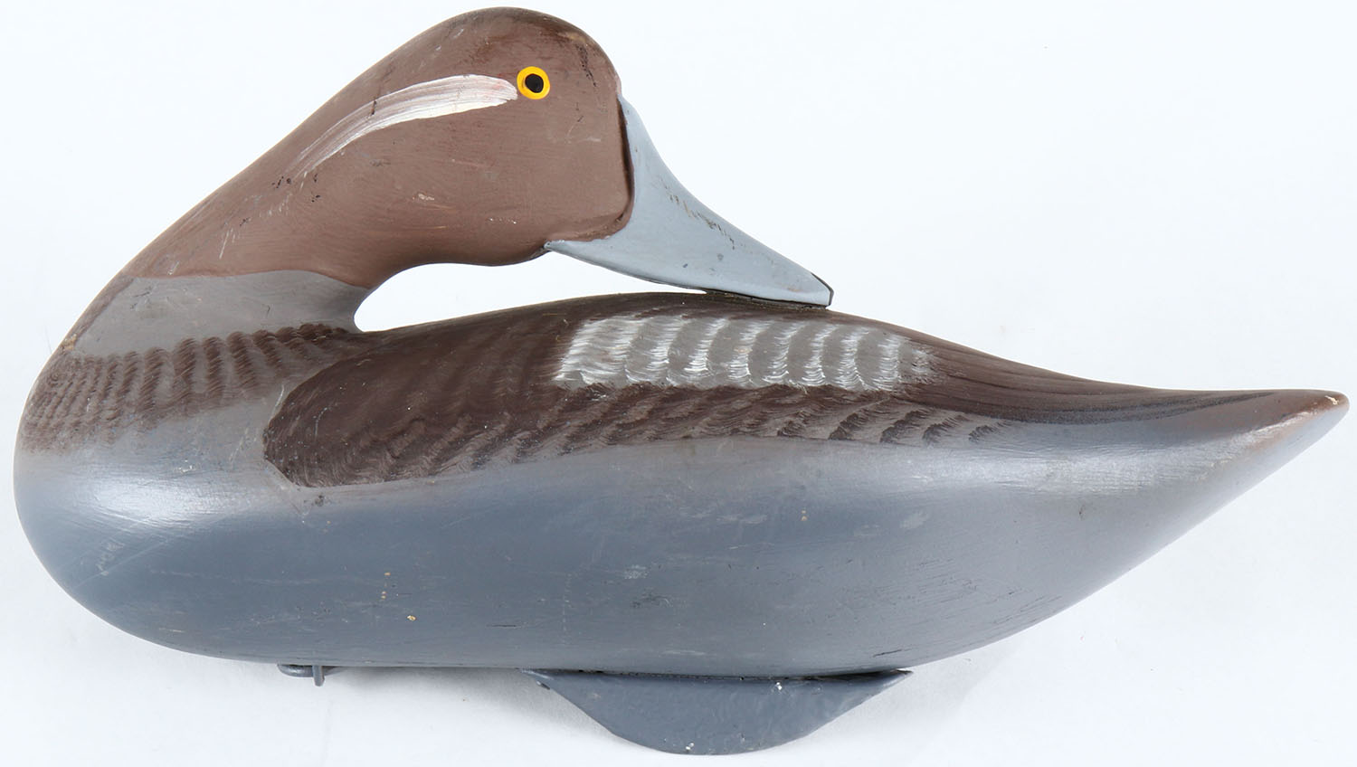 Preening Bufflehead Hen by unknown Maryland maker, painted eyes, solid wood, original paint, structurally excellent. Grade: Excellent - Value: 40 to 80