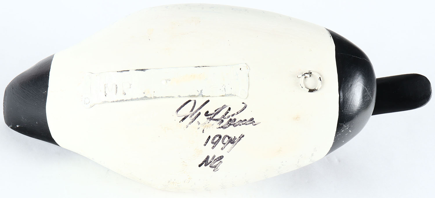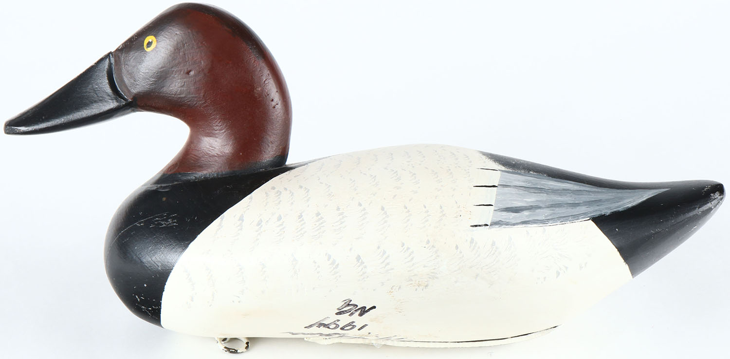 Canvasback Drake by unknown Maryland maker, painted eyes, solid wood, original paint, structurally excellent, signed on bottom. Grade: Excellent - Value: 50 to 100