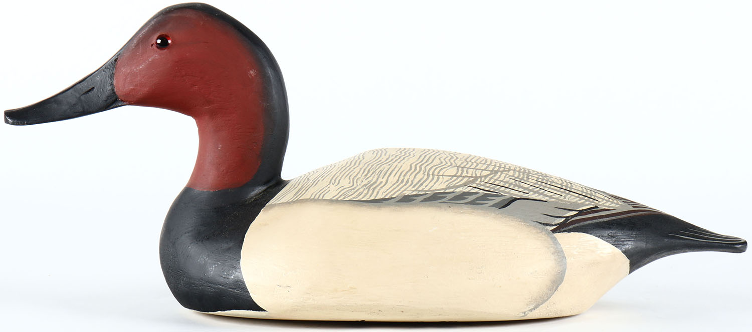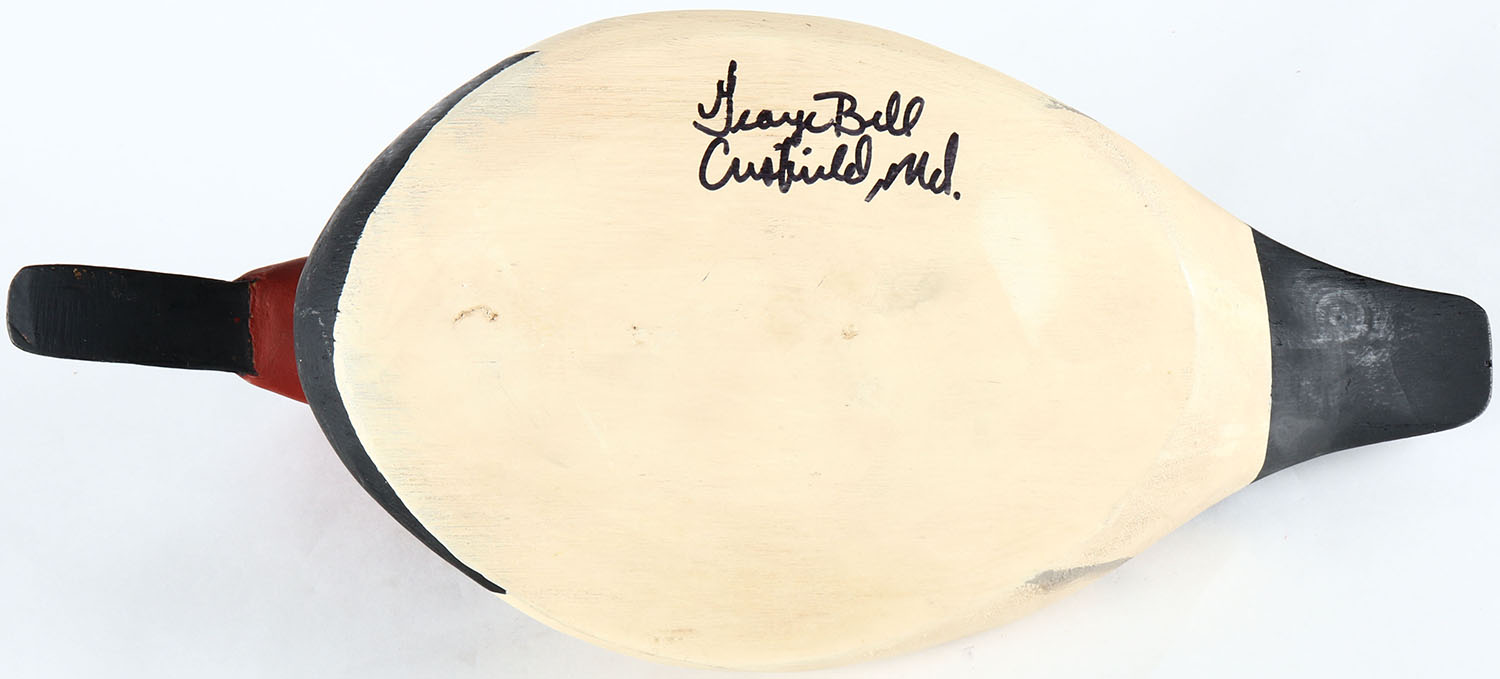 Canvasback Drake by George Bell, Crisfield, MD. Glass eyes, solid wood, original paint, structurally excellent, signed on bottom. Grade: Excellent - Value: 70 to 150