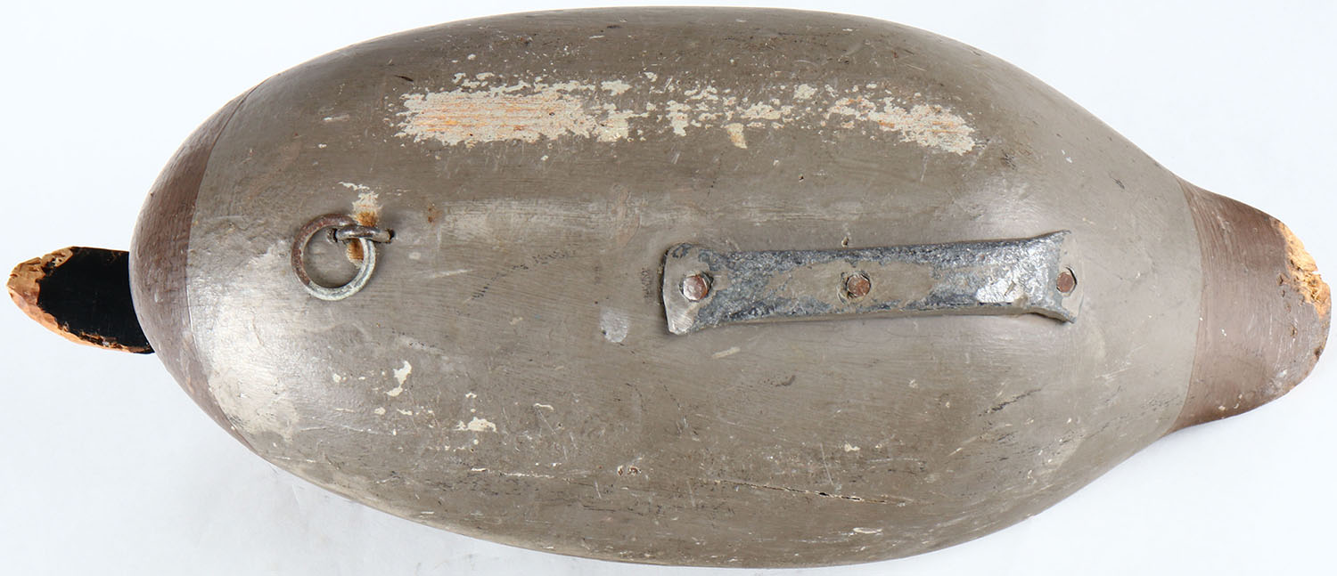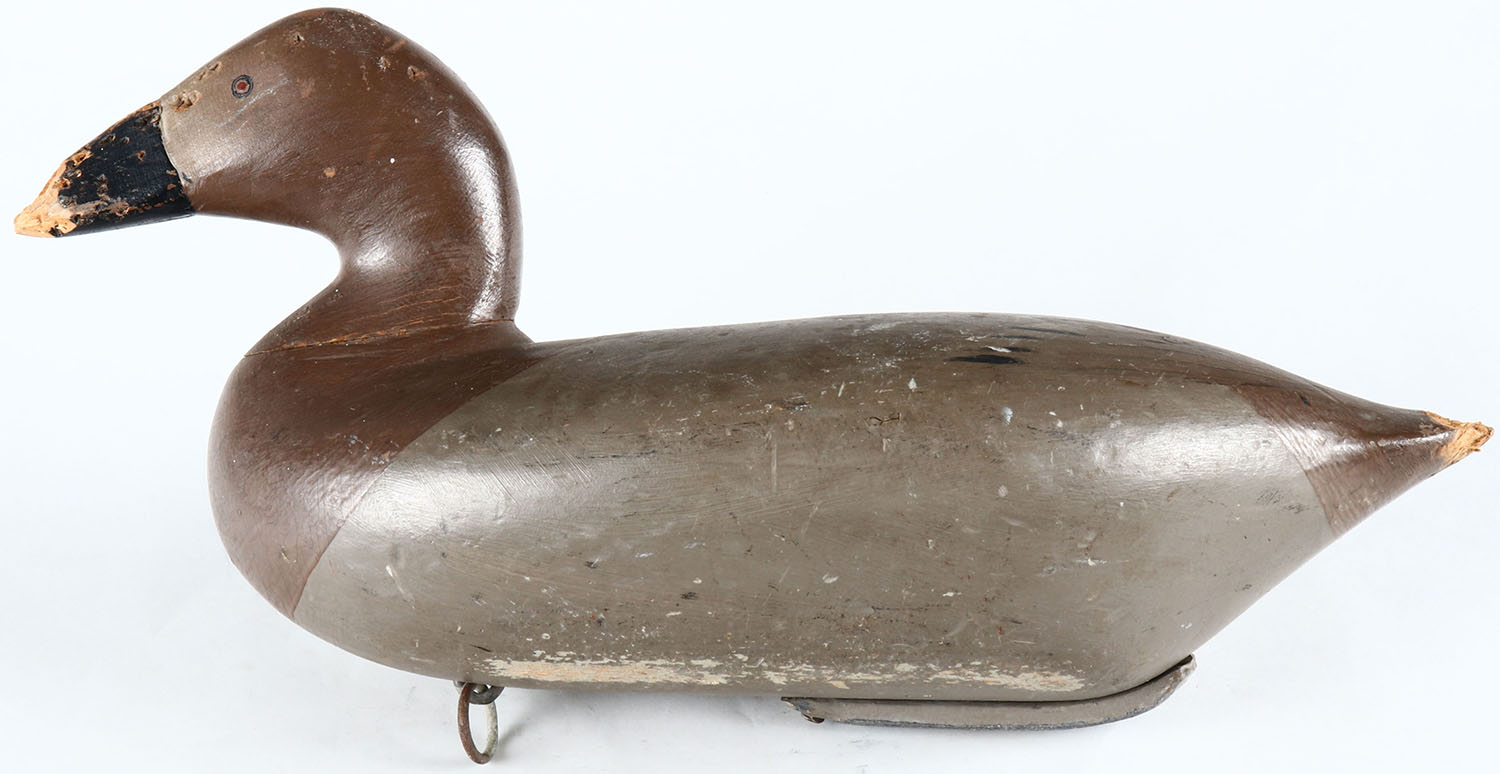 Canvasback Hen by unknown Maryland maker, painted eyes, solid wood, original paint, has damage to the bill and wear to the tail. Grade: Good - Value: 50 to 100