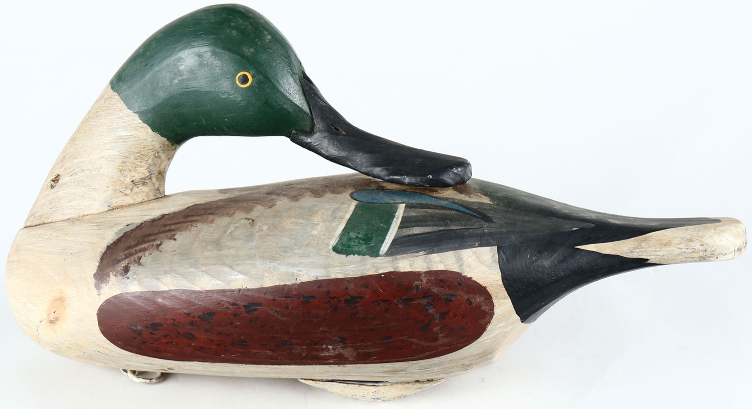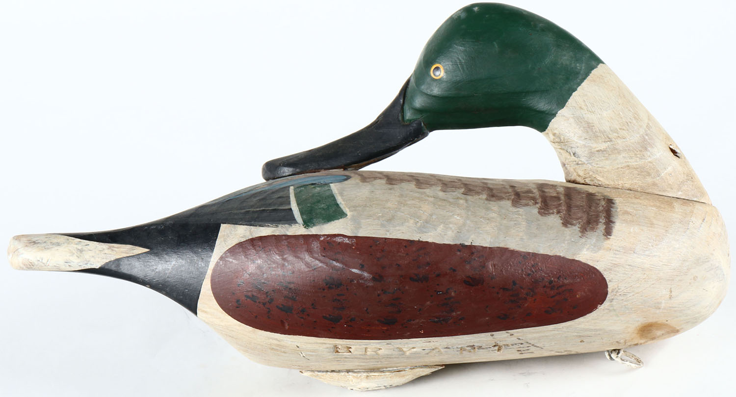 Preening Shoveler Drake by Capt. Bryant, Perryville, MD, painted eyes, solid wood, original paint, structurally excellent, branded BRYANT on bottom. Grade: Excellent - Value: 50 to 100