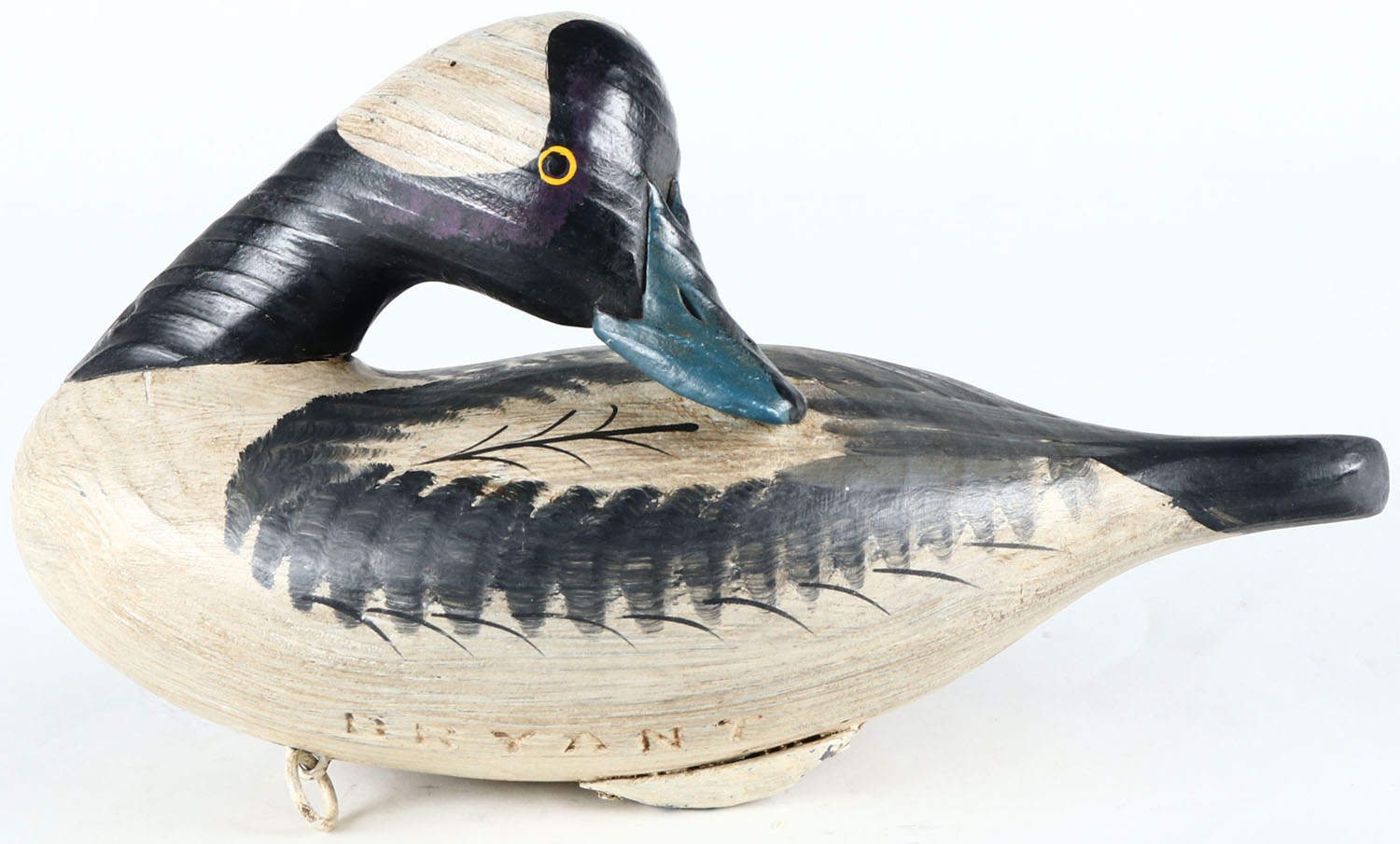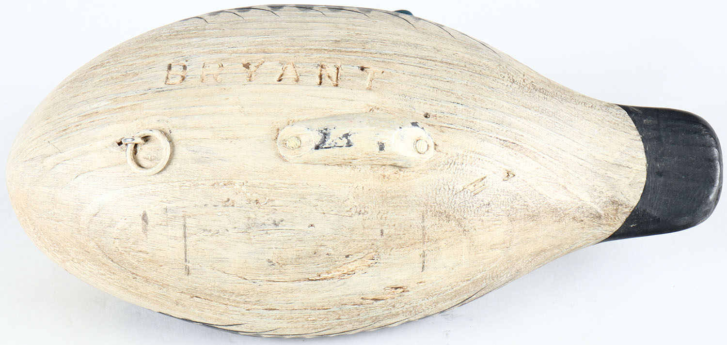 Preening Bufflehead Drake by Capt. Bryant, Perryville, MD, painted eyes, solid wood, original paint, structurally excellent, branded BRYANT on bottom. Grade: Excellent - Value: 50 to 100