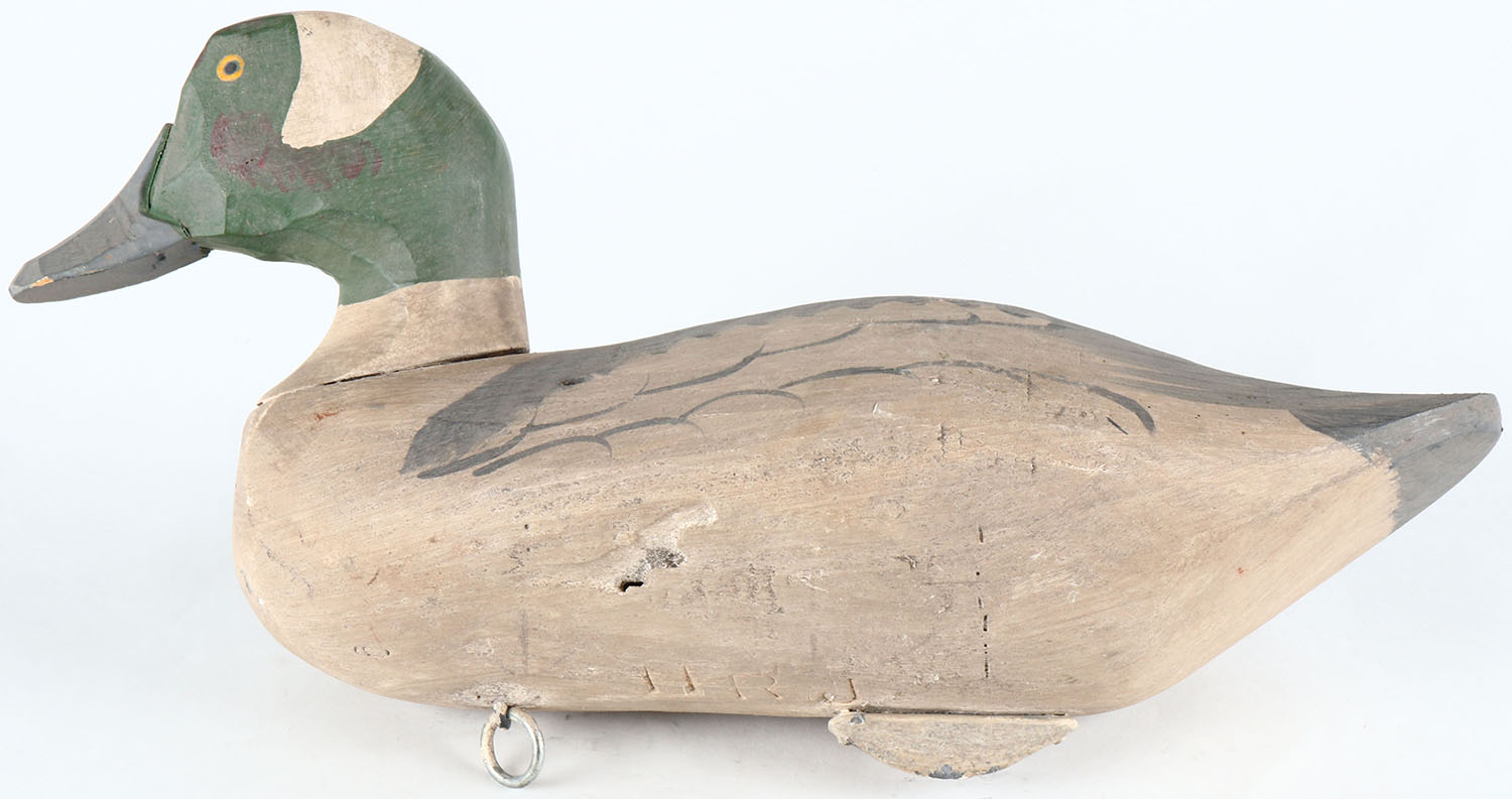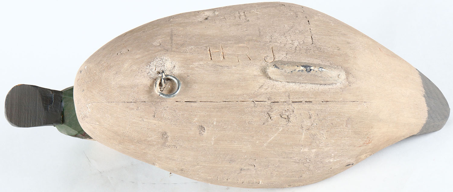 Bufflehead Drake by HRJ, painted eyes, solid wood, repainted ?, has age crack on bottom, branded HRJ on bottom. Grade: Excellent + - Value: 50 to 100