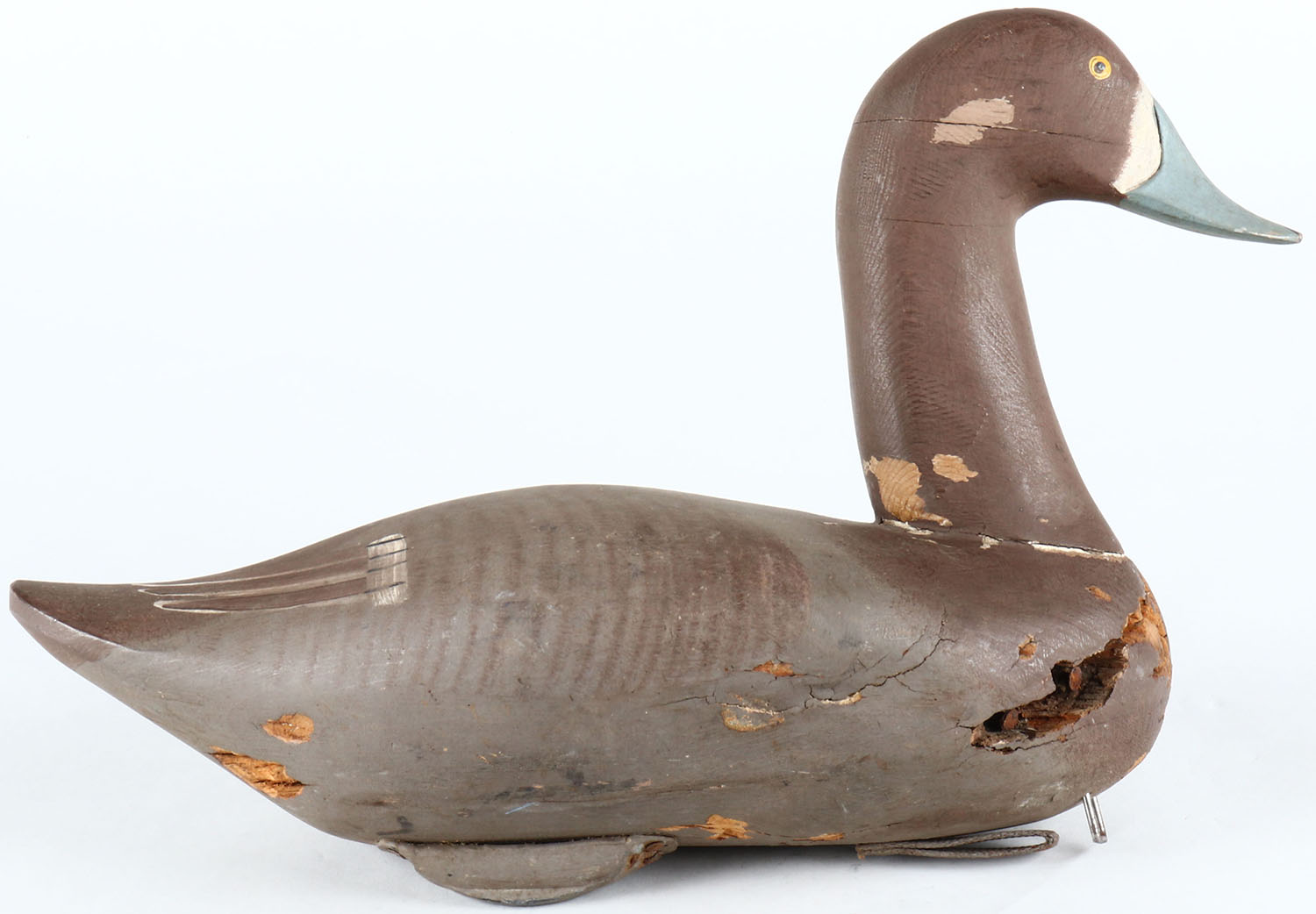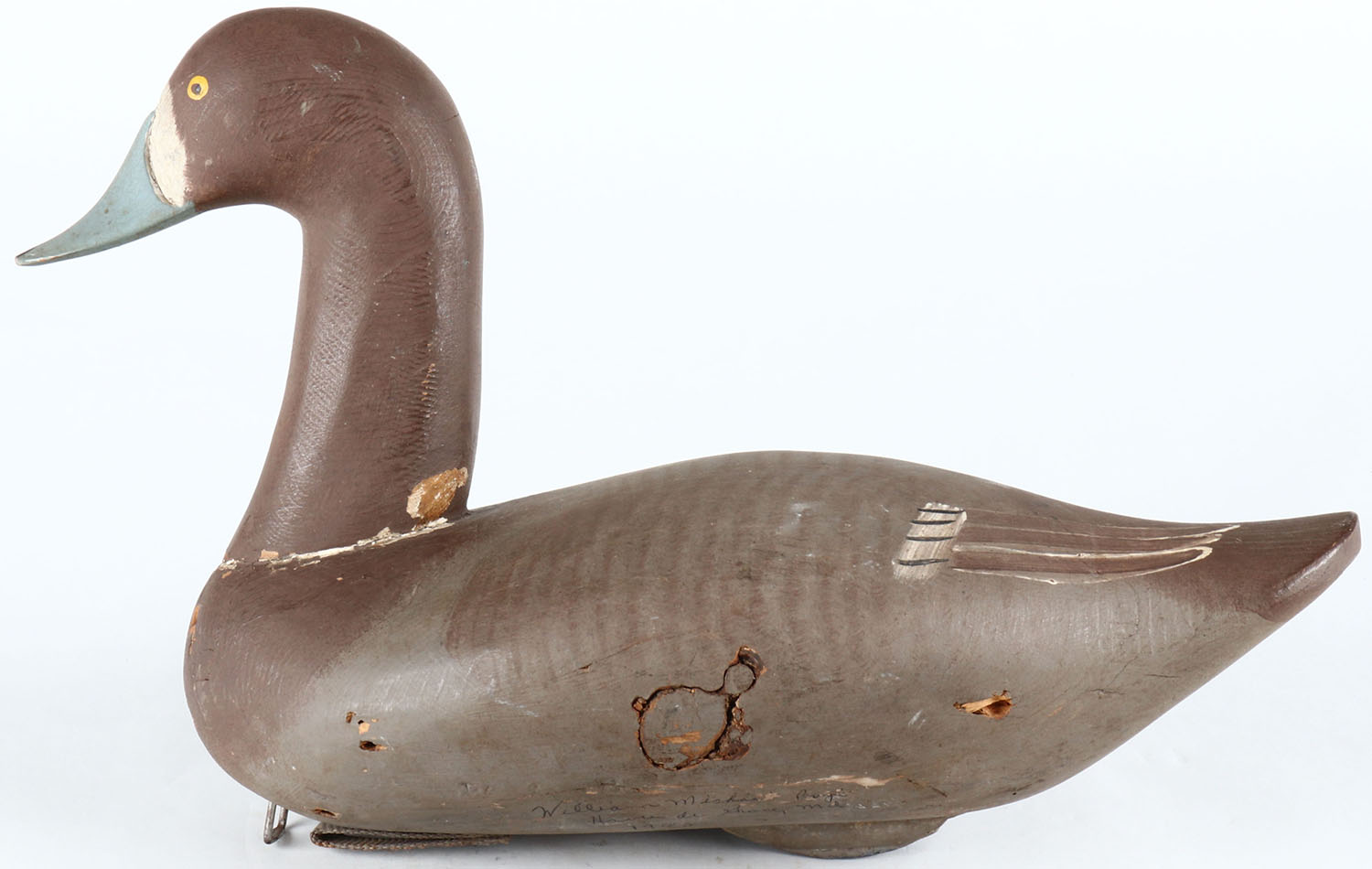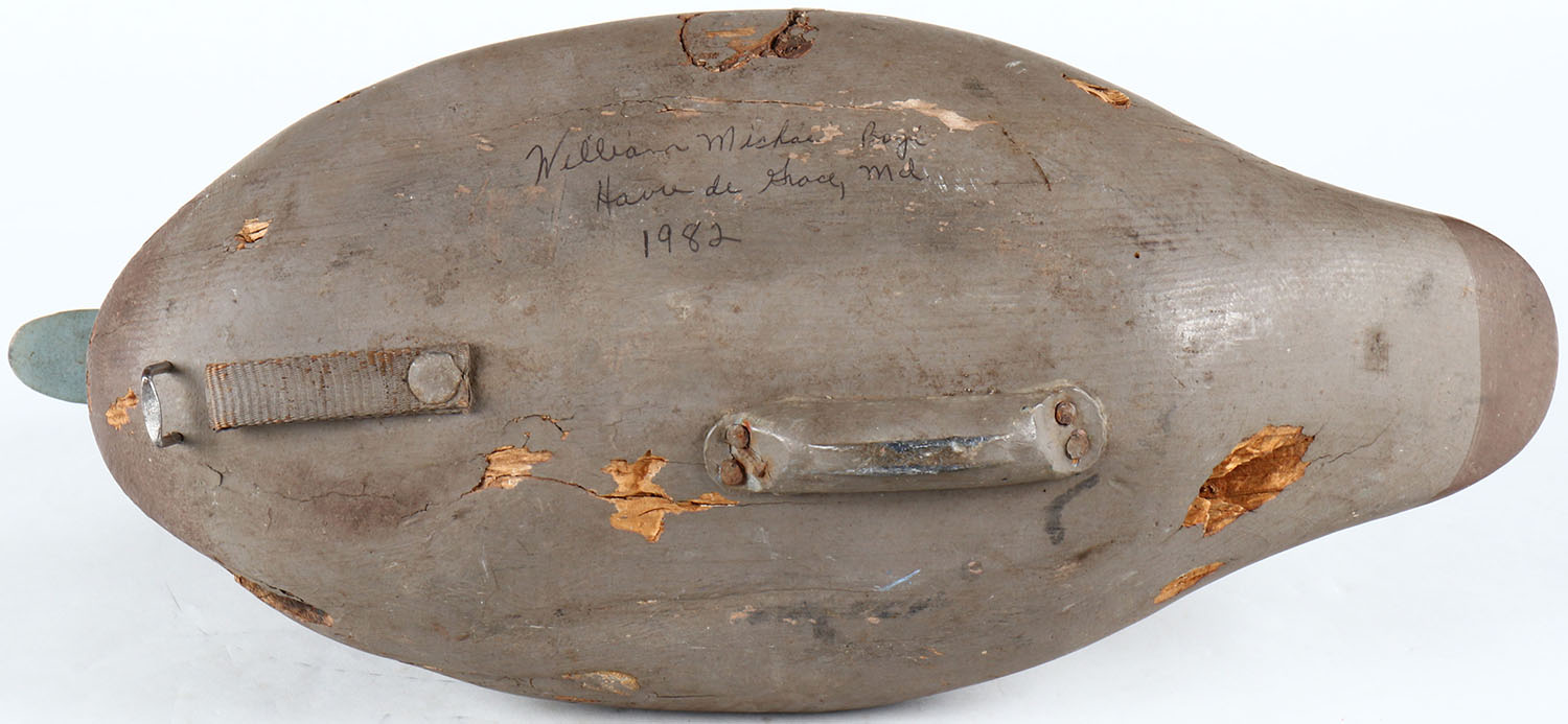 High neck Bluebill Hen by William Michael Boyd, Havre De Grace, MD, painted eyes, solid wood, original paint, has shot holes and some stable storage rot on body, signed on bottom. Grade: Very Good - Value: 50 to 100
