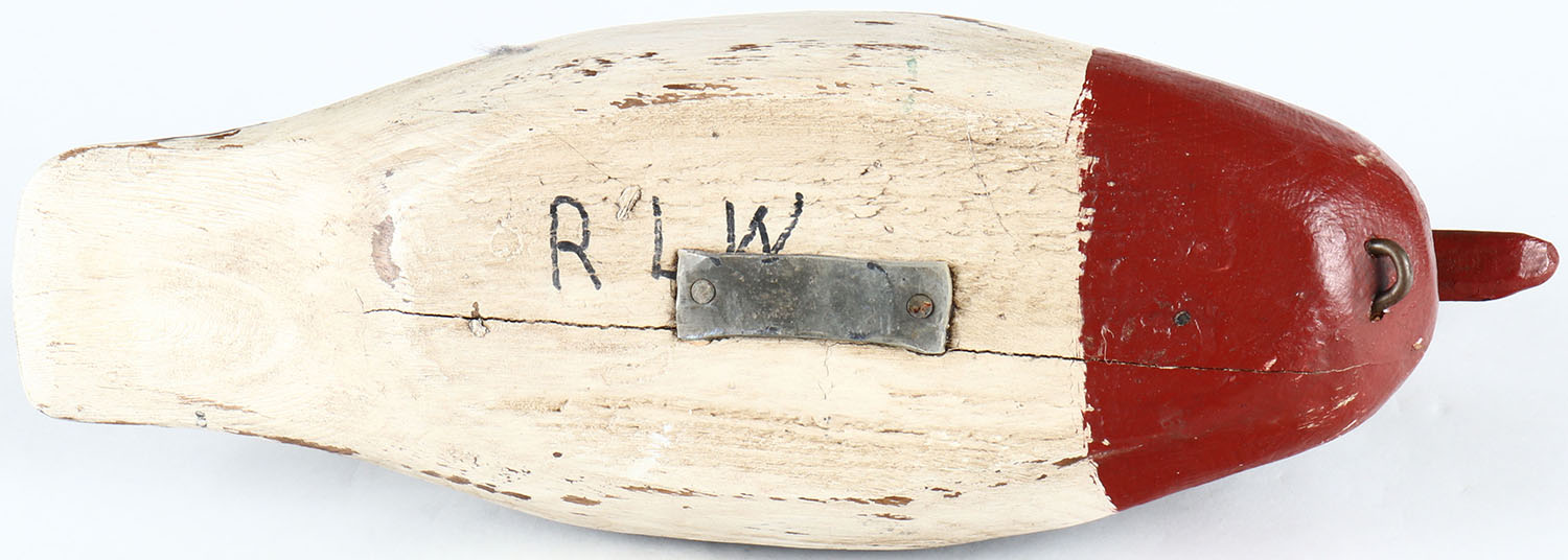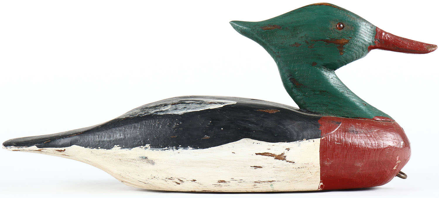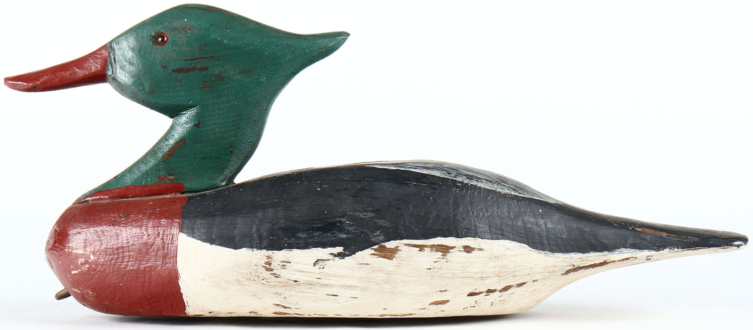 Hooded Merganser by unknown maker, glass eyes, solid wood, original paint aged to appear old, has age cracks on bottom. Grade: Excellent - Value: 40 to 80