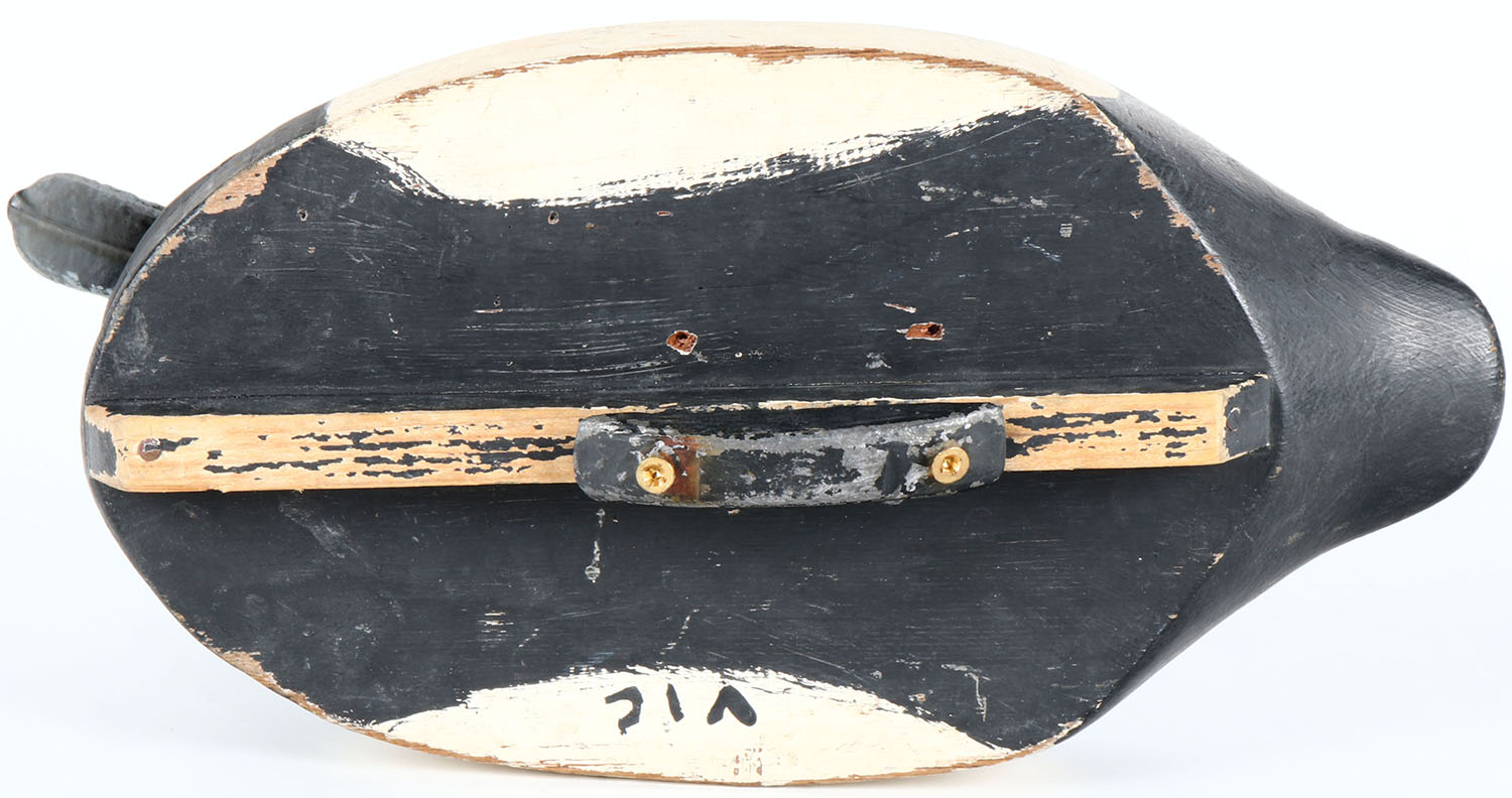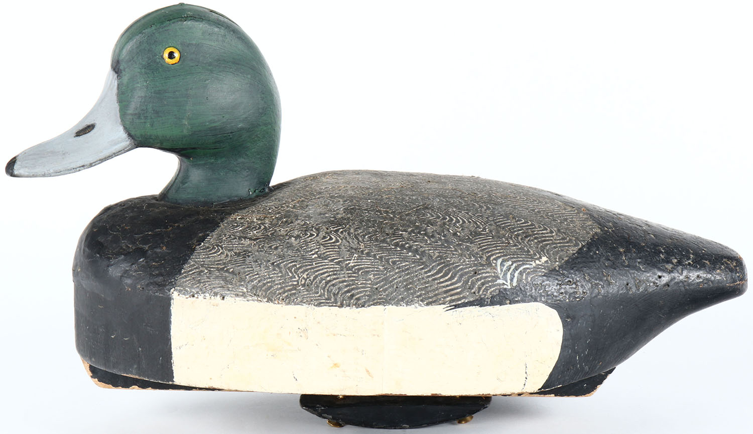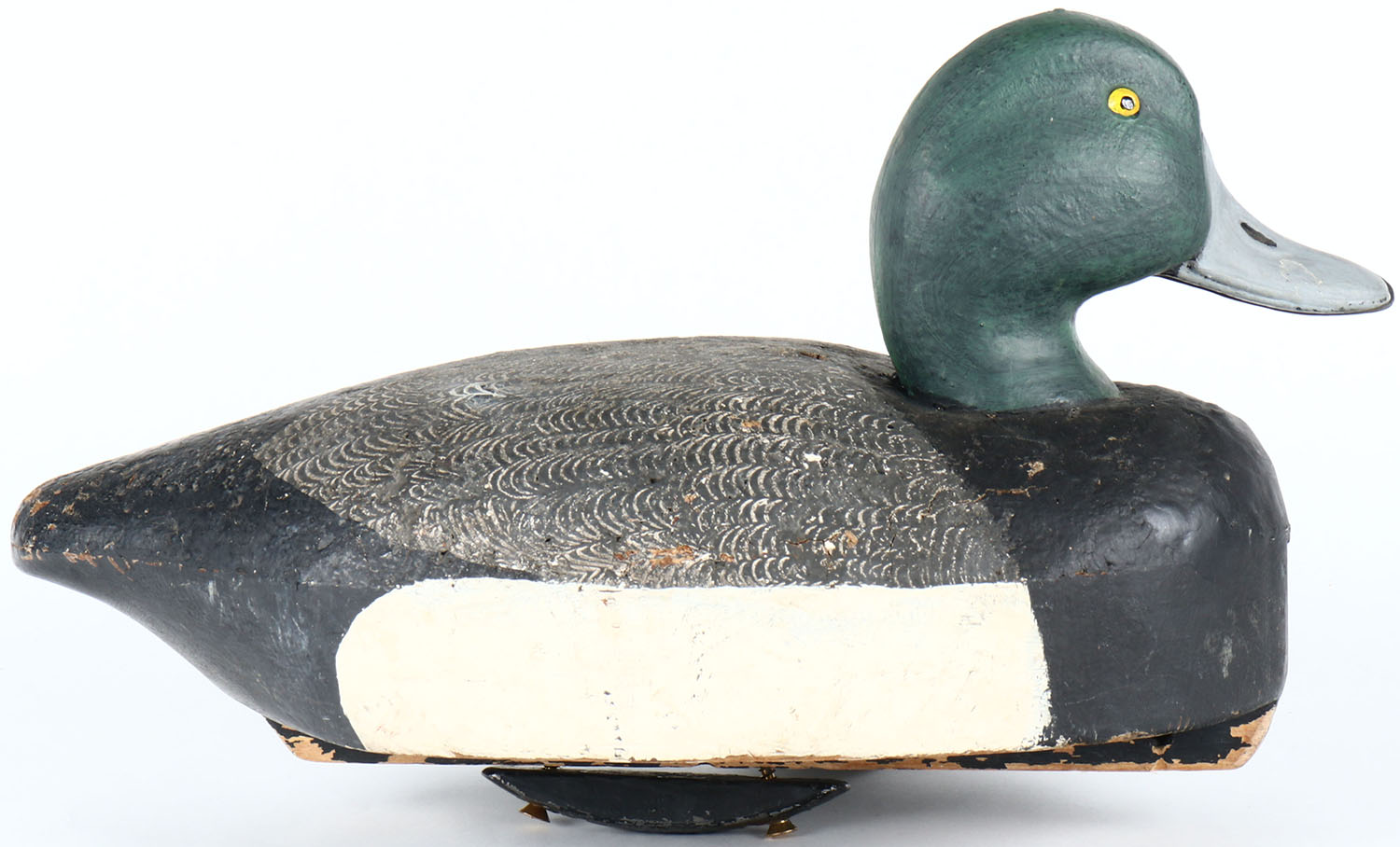 Bluebill Drake by Herters, Minnesota, painted eyes, solid wood with tenite head, old hunter repaint, structurally excellent. Grade: Good - Value: 20 to 40