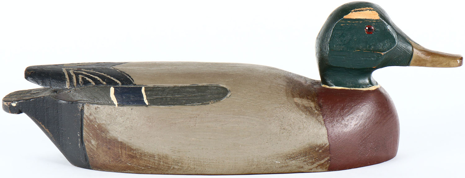 Mallard Drake by unknown maker, glass eyes, solid wood, original paint, has chip in head. Grade: Very Good + - Value: 50 to 100