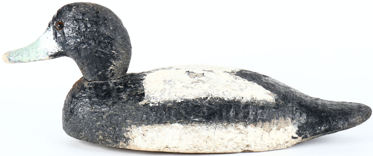 Bluebill Drake by a Pascagoula, MS factory, glass eyes, solid wood, old hunter repaint, structurally excellent. Grade: Very Good - Value: 20 to 40