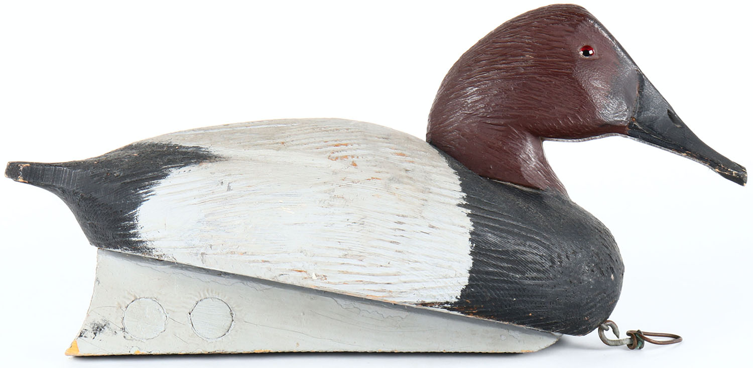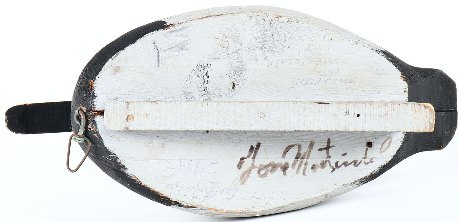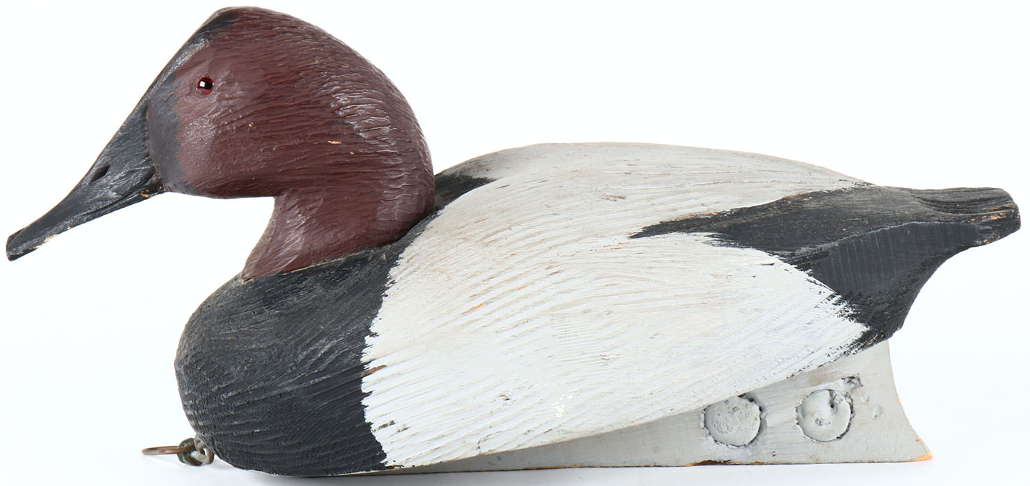 Canvasback Drake by Tom Martindale, Wolfe Island, Ontario, Canada, glass eyes, solid wood, original paint, structurally excellent, branded and signed on bottom. Grade: Excellent - Value: 50 to 100