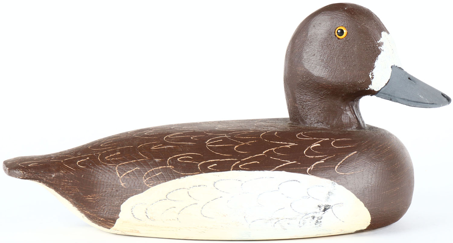 Bluebill Hen by Archie Cameron, Kingston, Ontario, Canada, glass eyes, solid wood, original paint, structurally excellent, stamped by maker on bottom. Grade: Excellent - Value: 40 to 80