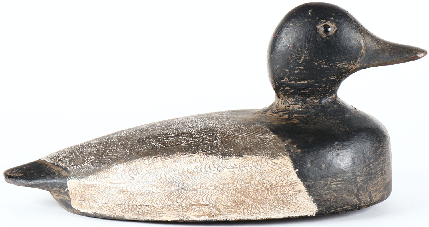 Bluebill Drake by unknown maker, glass eyes, hollow wood, original paint with comb painting, structurally excellent. Grade: Very Good + - Value: 40 to 80