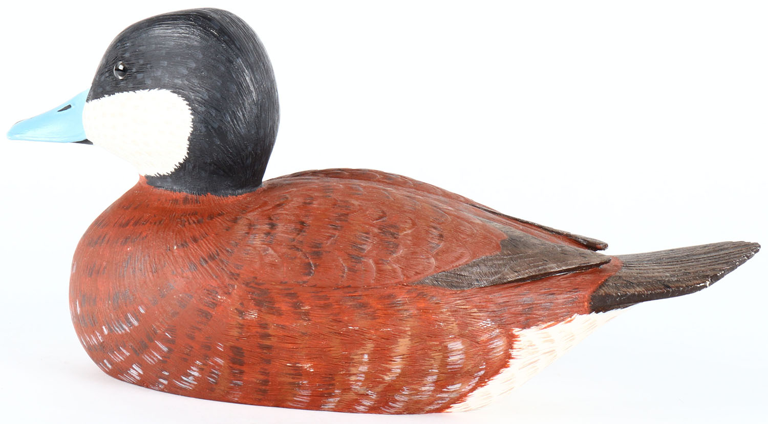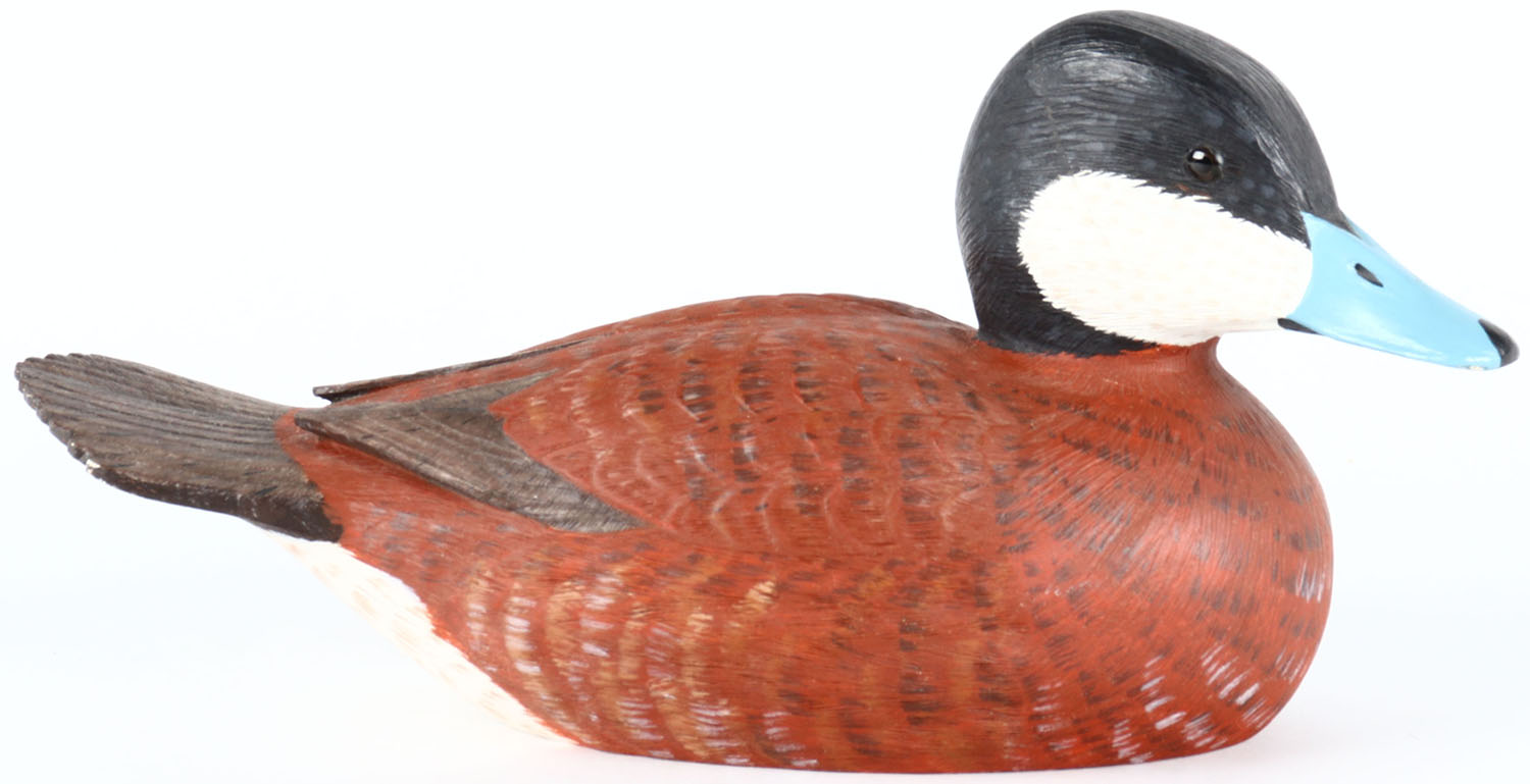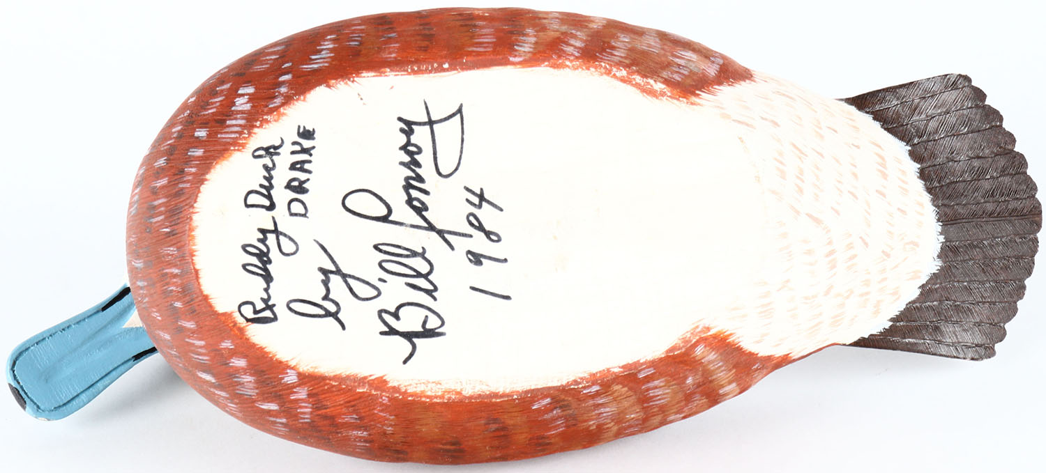 Ruddy Duck Drake by Bill Fonroy, glass eyes, solid wood, original paint, structurally excellent, signed on bottom. Grade: Excellent ++ - Value: 30 to 60