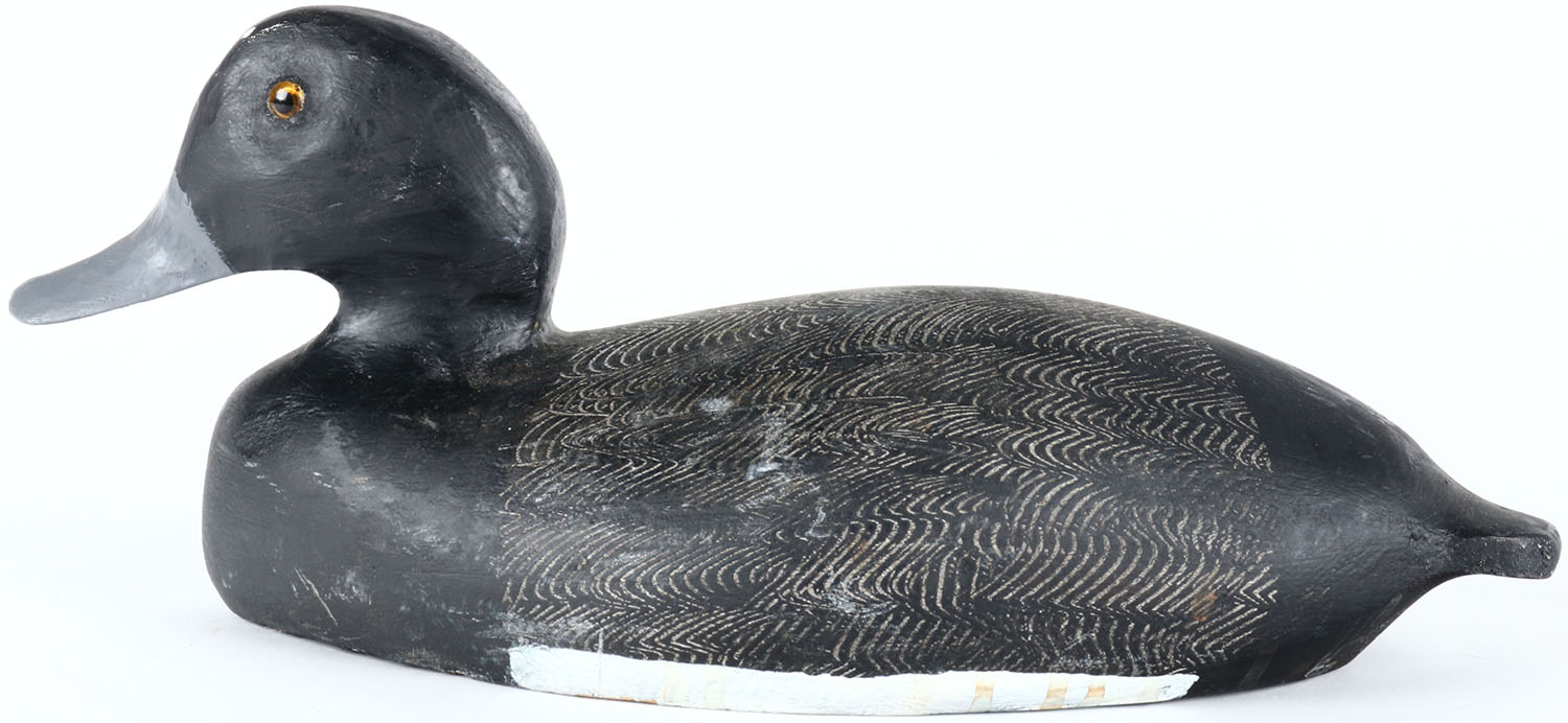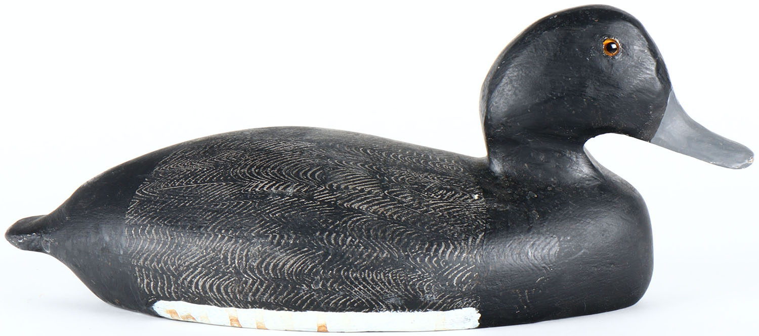 Bluebill Drake by unknown maker, glass eyes, solid wood, complete paint restoration with comb painting,