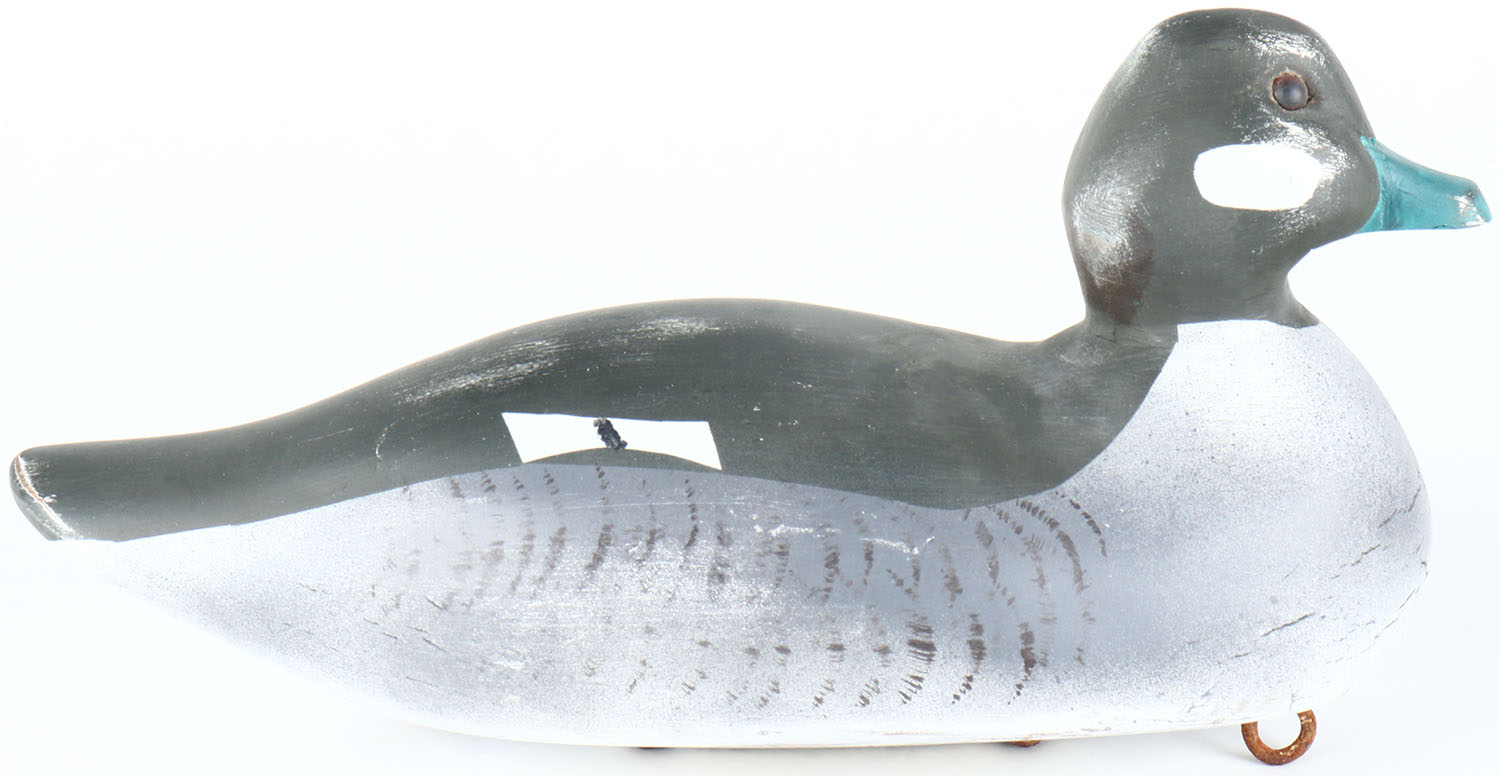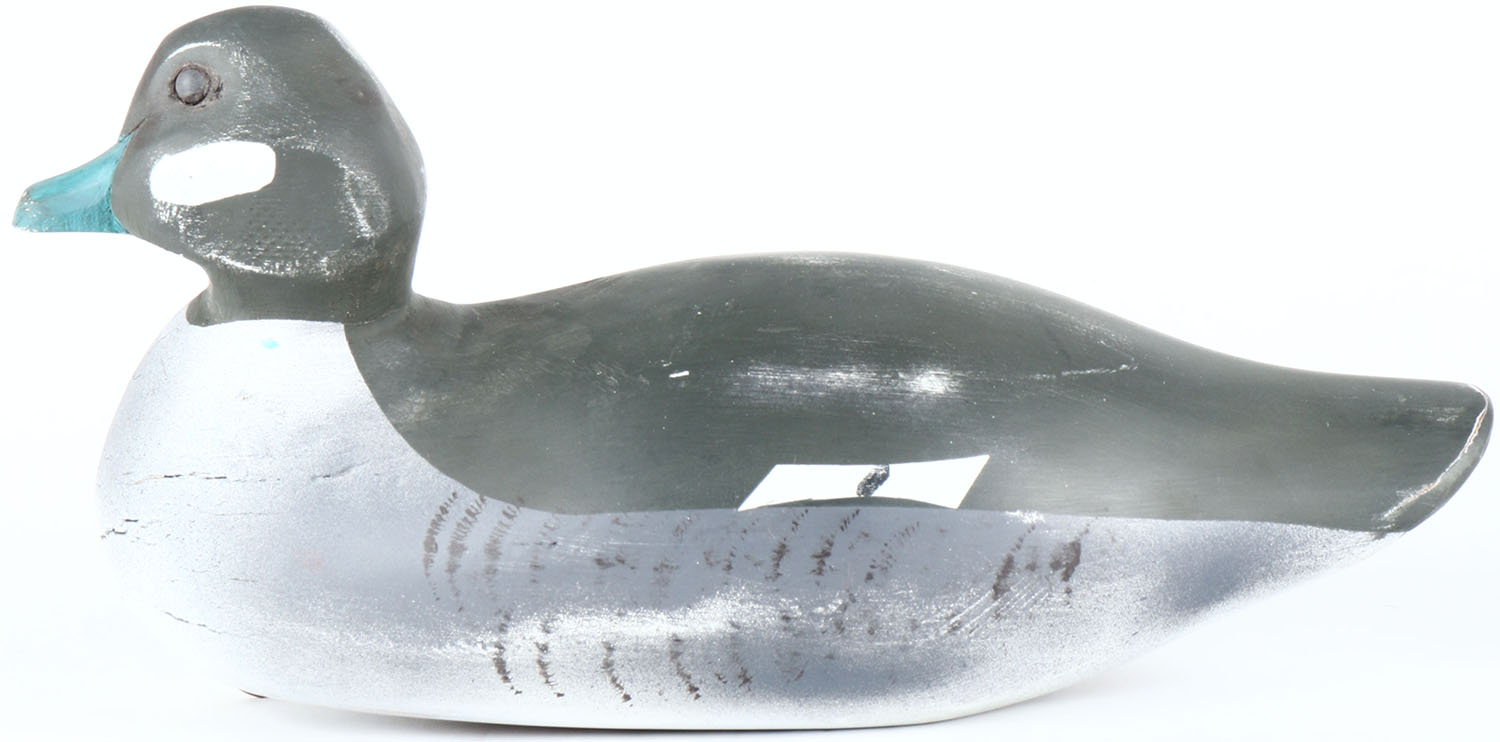 Bufflehead Hen by unknown maker, tack eyes, solid wood, original paint, has age cracks under neck. Grade: Very Good ++ - Value: 20 to 40