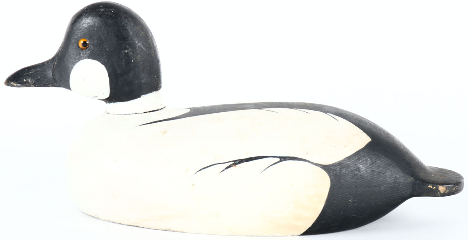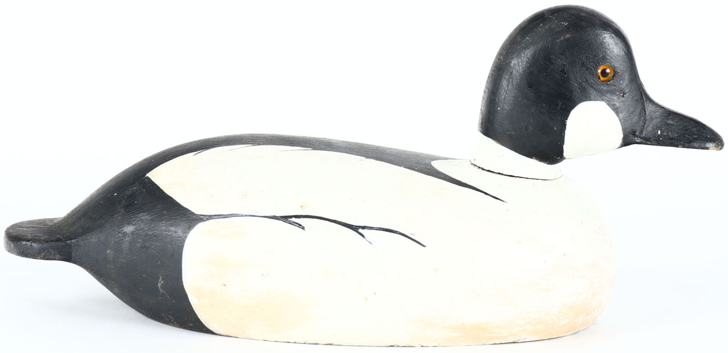 Goldeneye Drake by Jim Salisbury, Ontario, glass eyes, solid wood, original paint, structurally excellent, signed on bottom. Grade: Excellent + - Value: 40 to 80