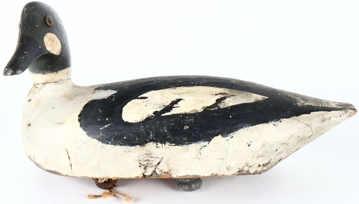 Goldeneye Drake by unknown maker, tack eyes, solid wood, old hunter repaint, has age cracks on body. Grade: Very Good + - Value: 30 to 60