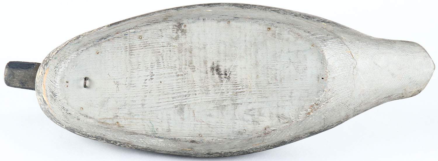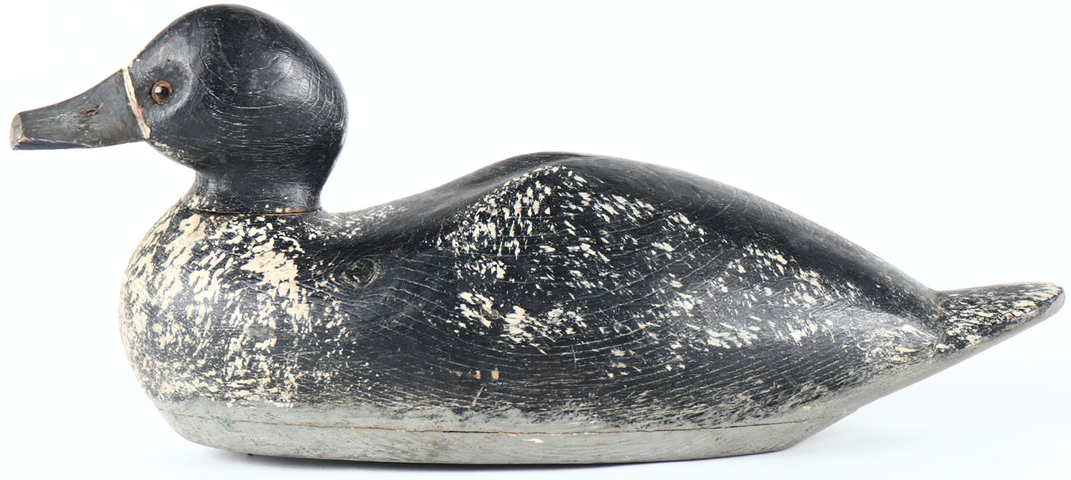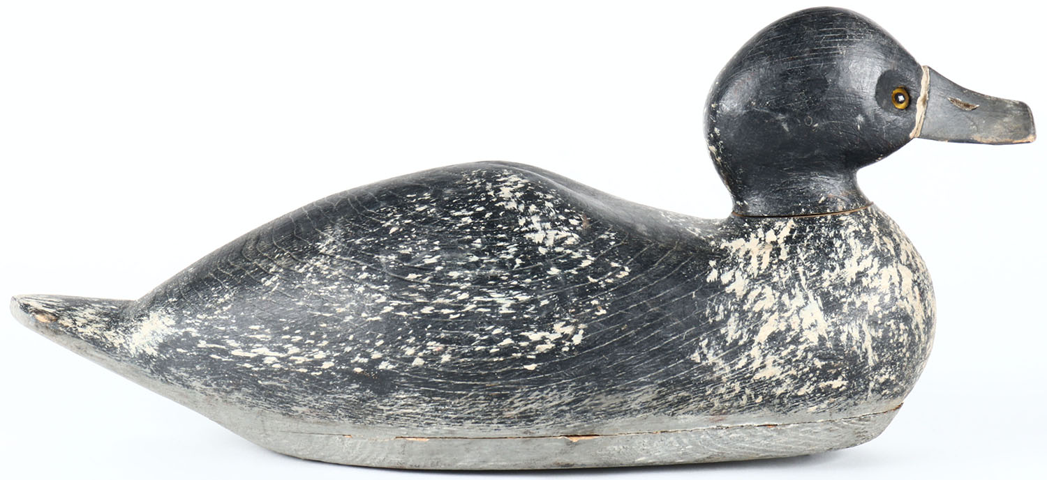 Humpback Bluebill Drake by unknown maker, glass eyes, hollow wood, original paint with possible paint added on the bottom by the hunter, head is loose. Grade: Very Good - Value: 50 to 100