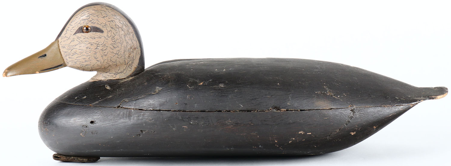 Black Duck by unknown Connecticut maker, glass eyes, hollow wood, a combination of original paint and hunter repaint, bill tip is chipped. Grade: Very Good - Value: 40 to 80