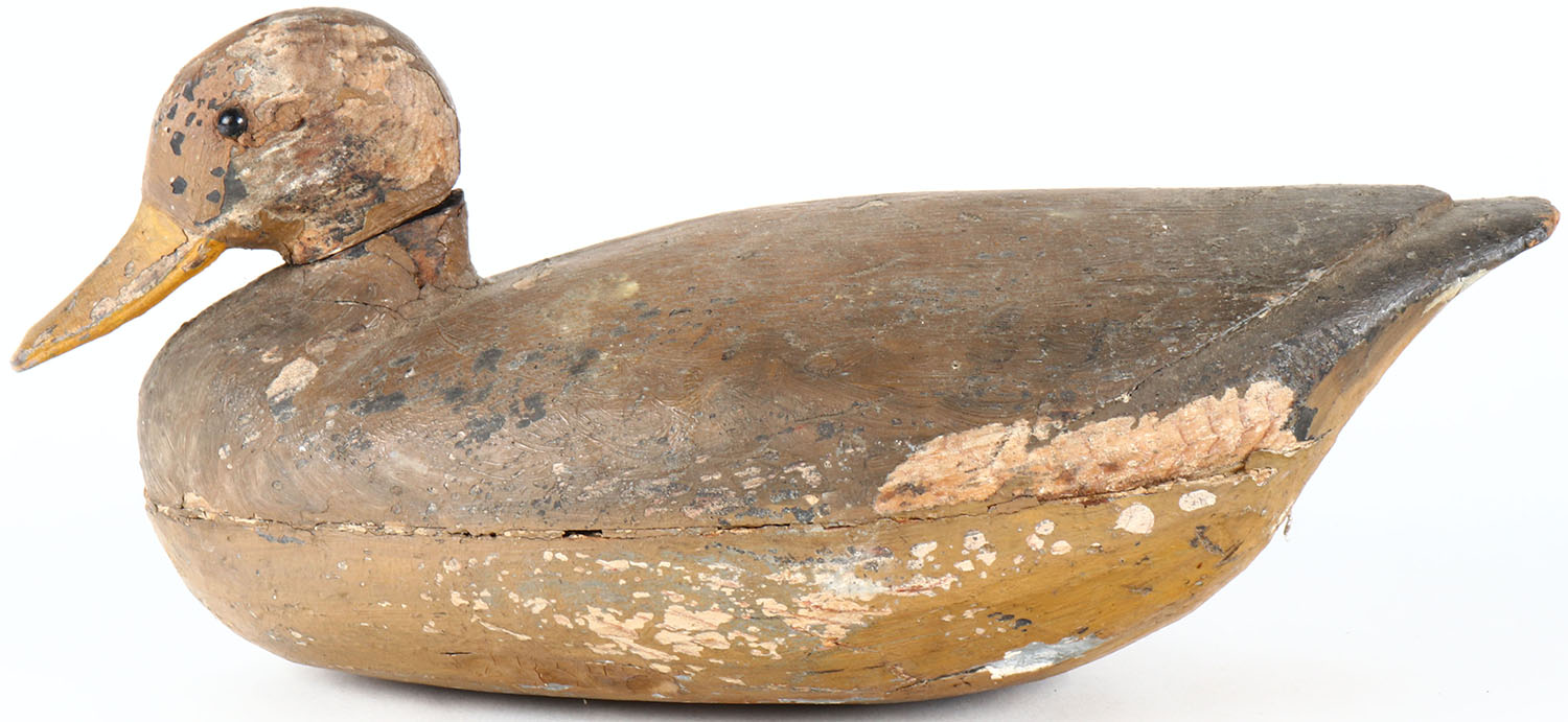 Mallard Hen by unknown maker, glass eyes, hollow wood, old hunter working repaint, neck is cracked. Grade: Very Good - Value: 20 to 40