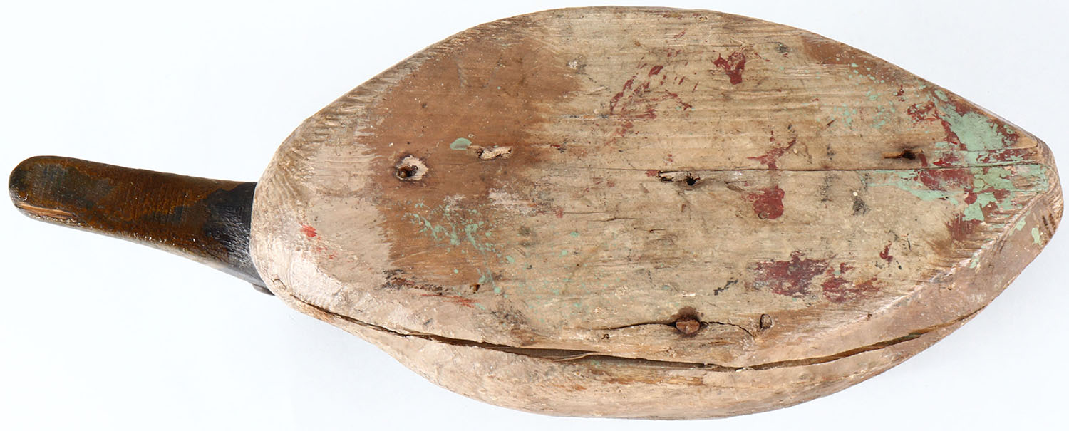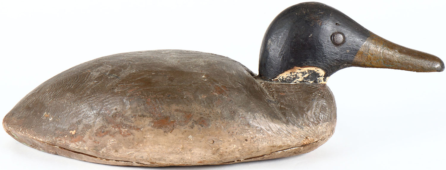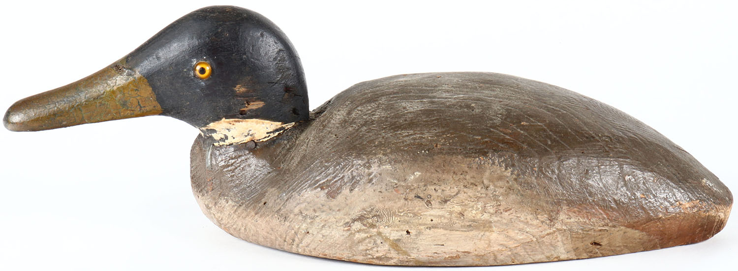 Mallard Drake by unknown maker, tack eyes, solid wood, original paint, has age cracks on bottom. Grade: Very Good + - Value: 50 to 100
