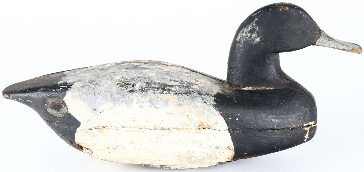 Bluebill Drake by unknown maker, no eyes, solid wood, old hunter working repaint, has age cracks on entire body. Grade: Very Good - Value: 40 to 80