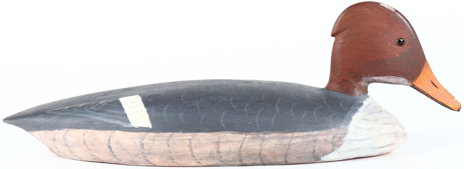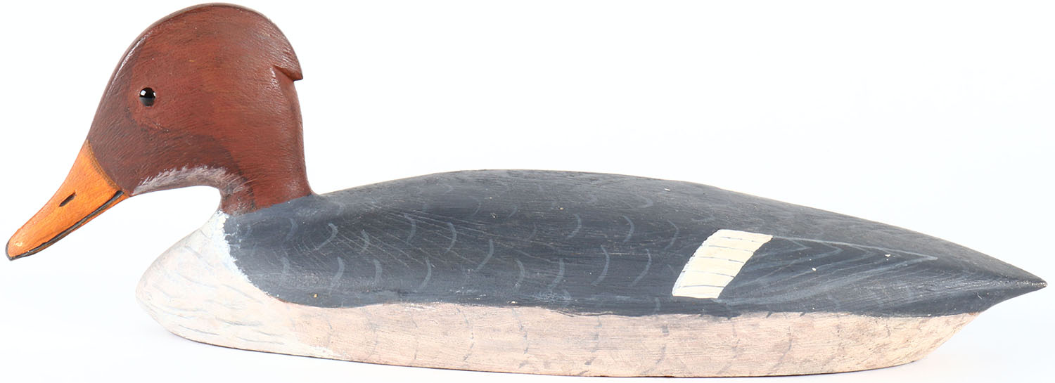 Hooded Merganser by Maynard Caine, Ontario, Canada, glass eyes, solid wood, original paint, branded M on bottom. Grade: Excellent + - Value: 40 to 80
