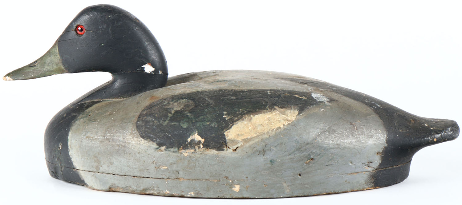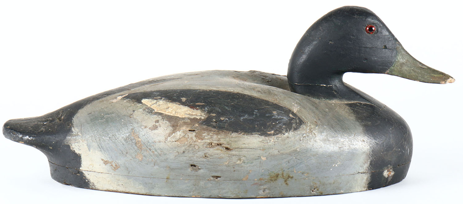 Mallard Drake by unknown maker, glass eyes, solid wood, original paint, bill is chipped. Grade: Very Good + - Value: 20 to 40