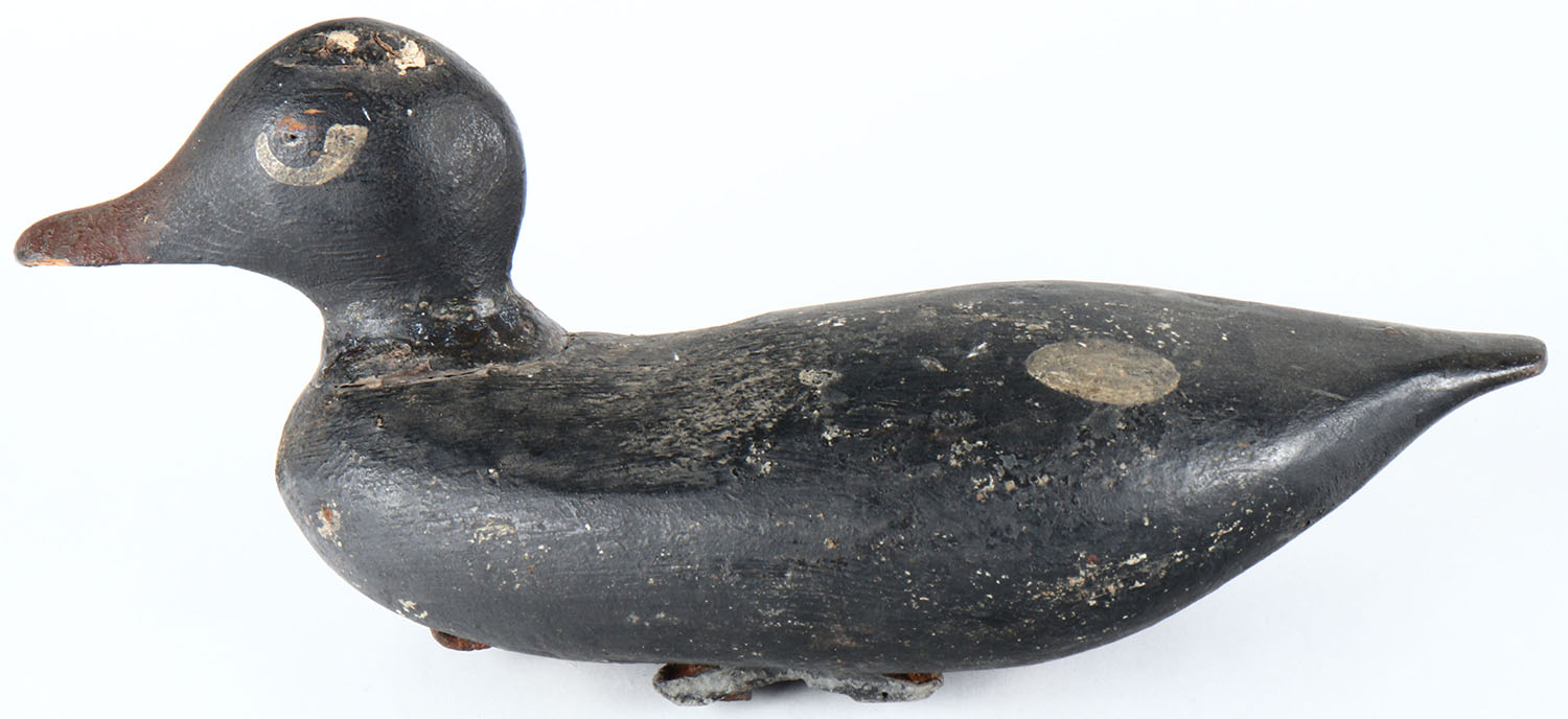 Scoter by unknown New England maker, painted eyes, solid wood, combination of original and hunter working touch-up, has age cracks on bottom, head has chips in it. Grade: Very Good + - Value: 80 to 150