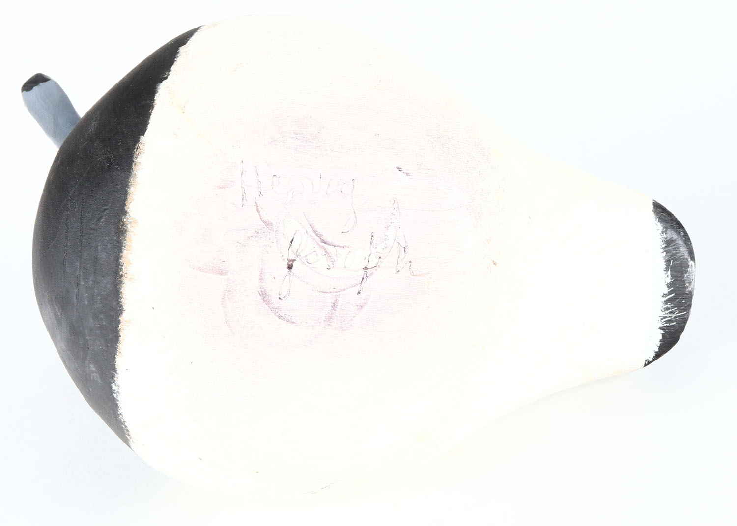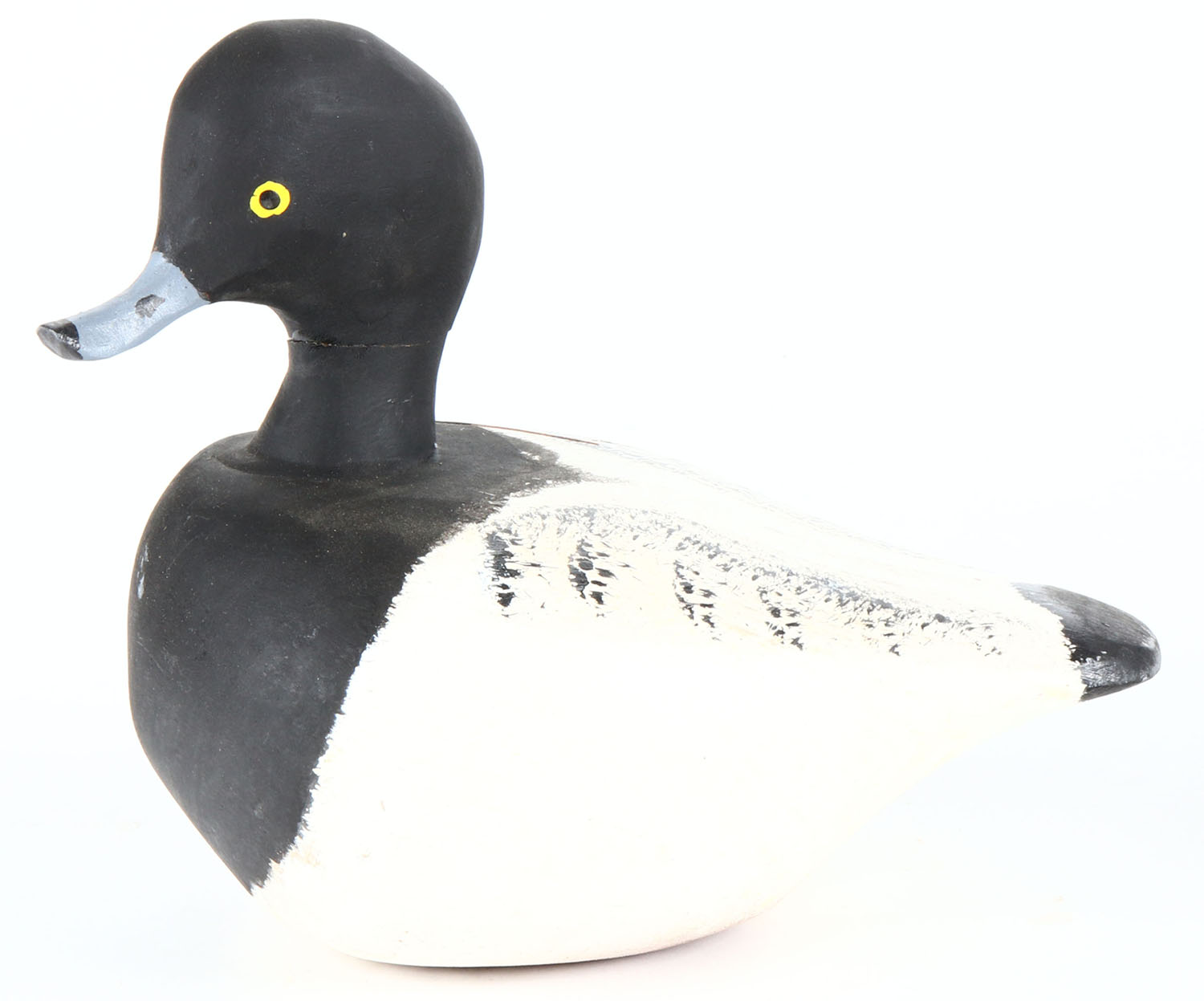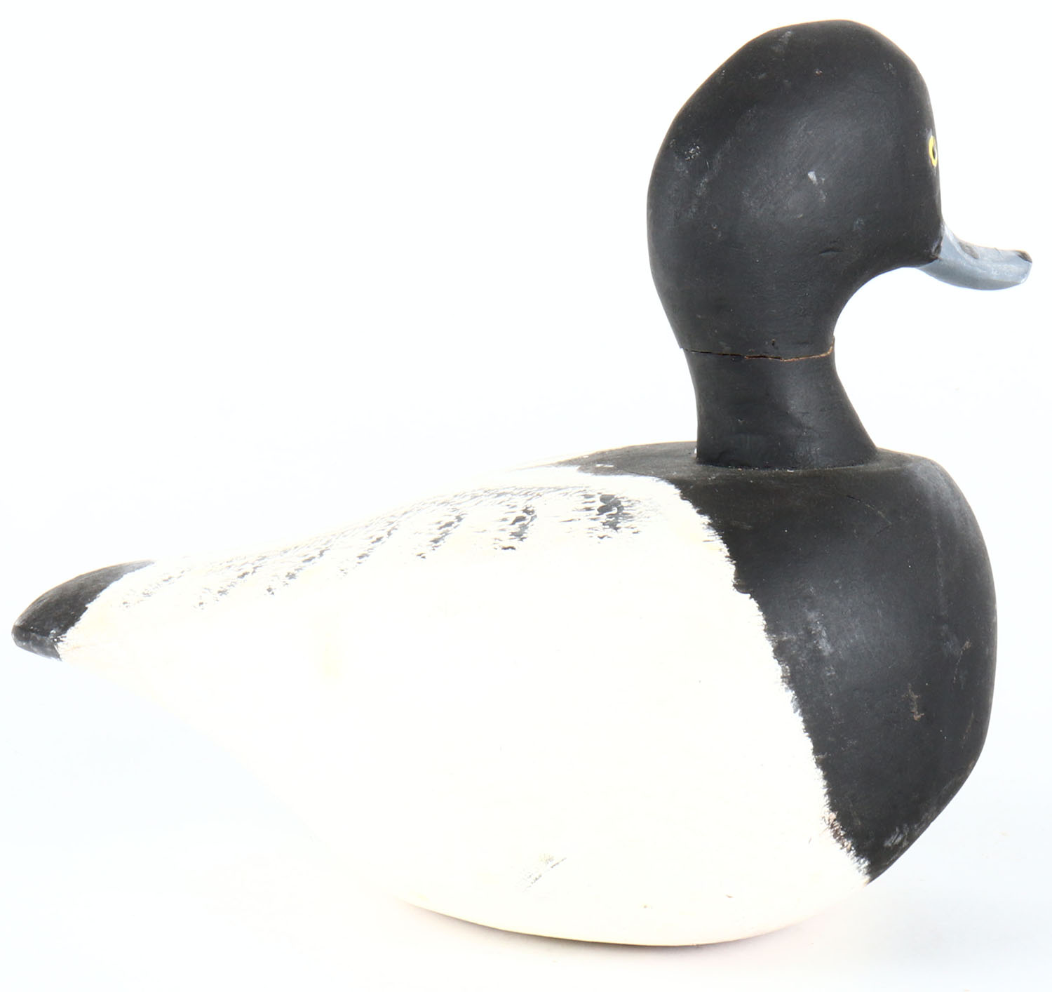 Bluebill Drake by Henry Joseph, painted eyes, solid wood, original paint, has crack around neck, has age crack near neck. Grade: Very Good + - Value: 20 to 40