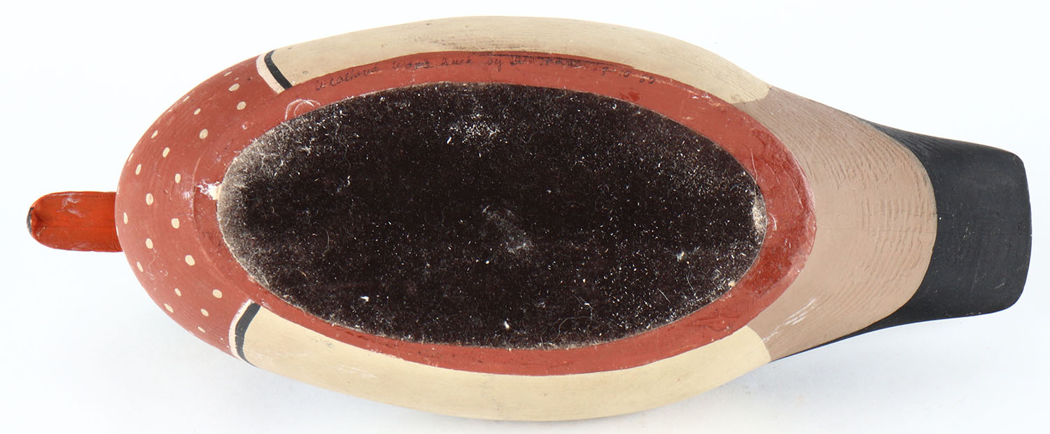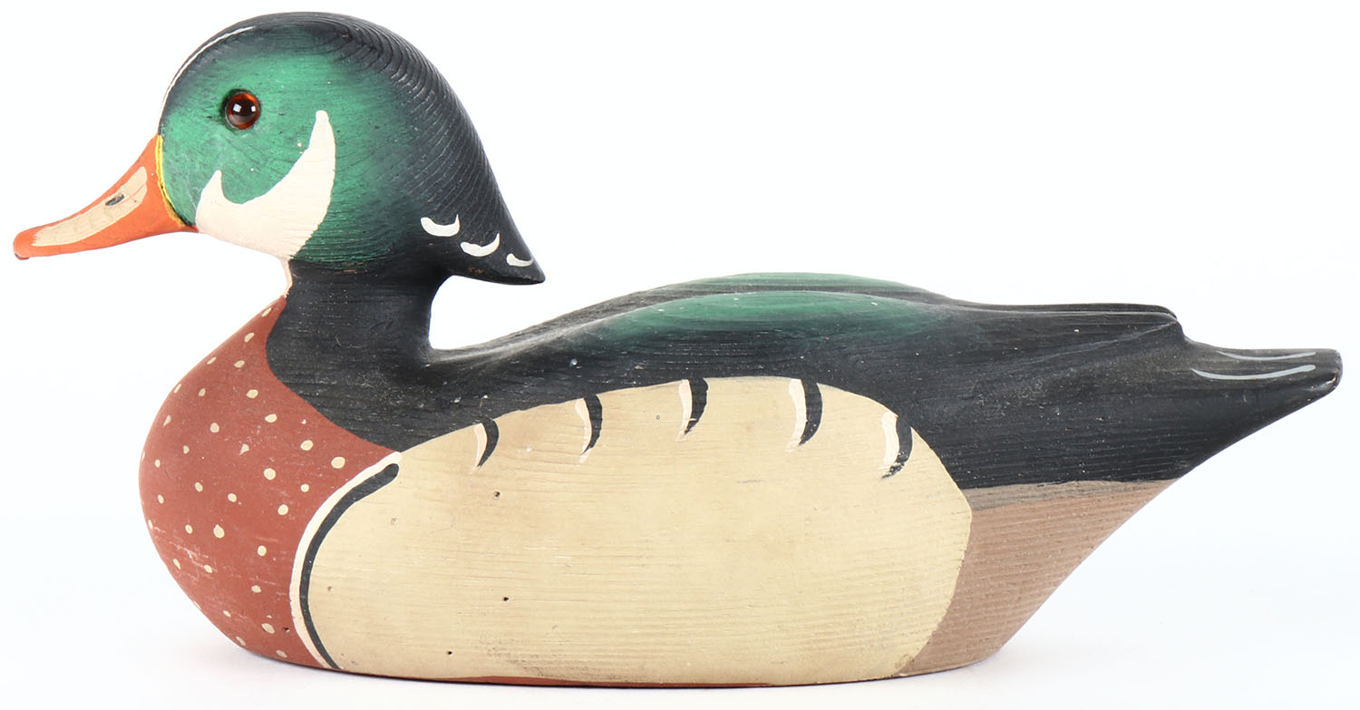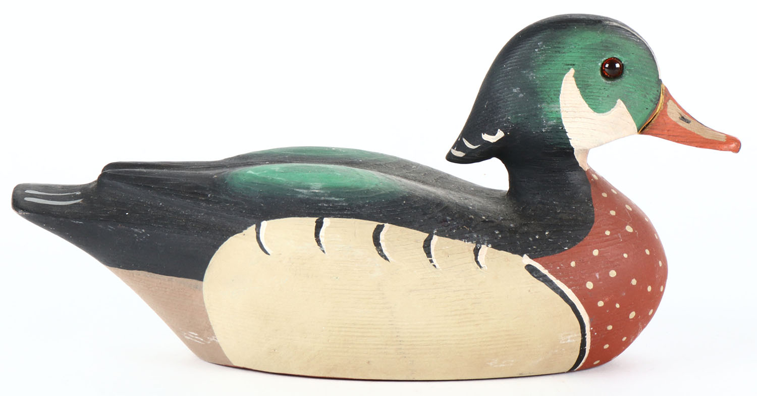 Woodduck Drake by unknown maker, glass eyes, hollow wood, original paint, structurally excellent. Grade: Excellent + - Value: 30 to 60