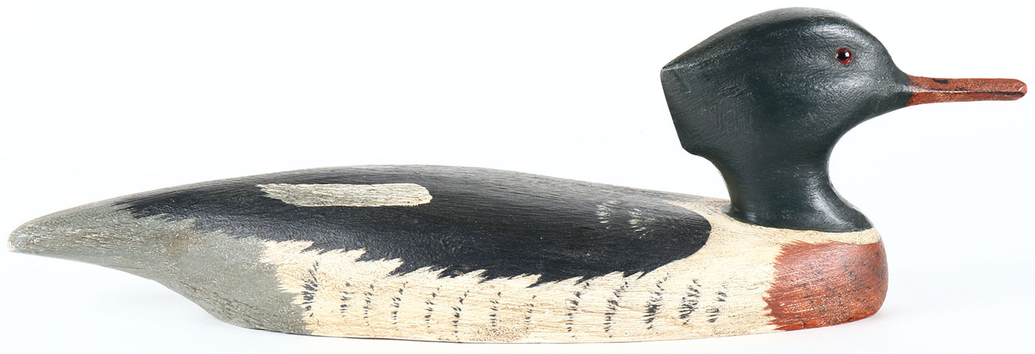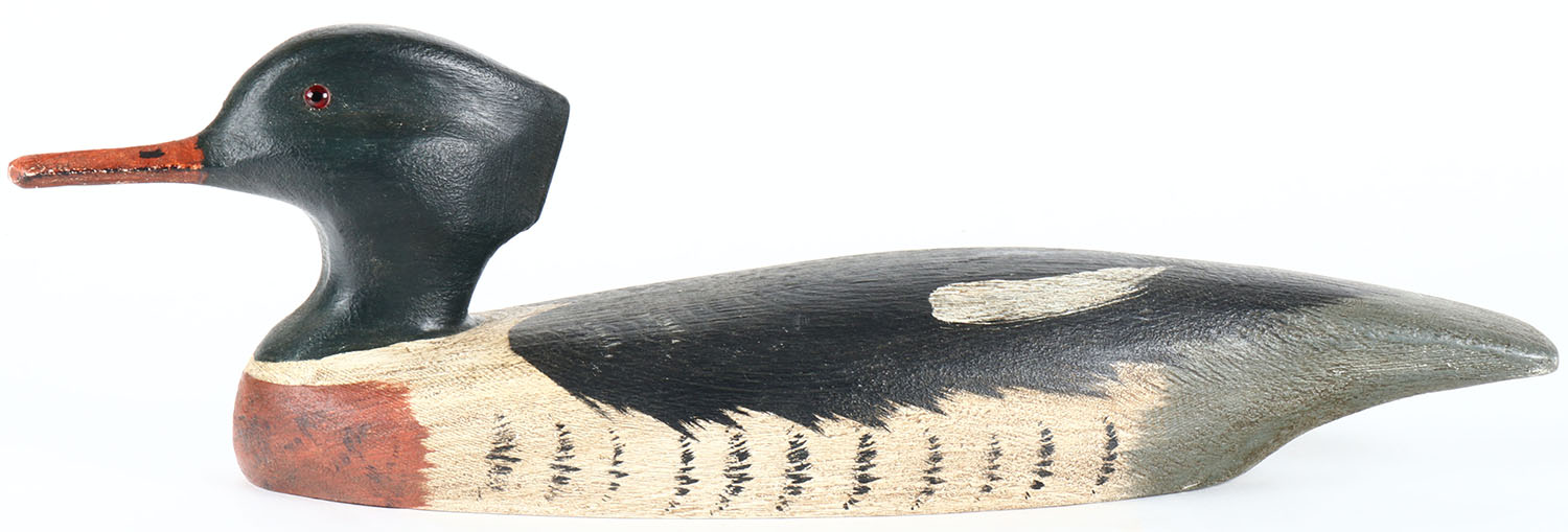 Merganser by B.J. Pawlaczyk, MI, glass eyes, solid wood, original paint, structurally excellent, branded BJ on bottom. Grade: Excellent - Value: 50 to 100
