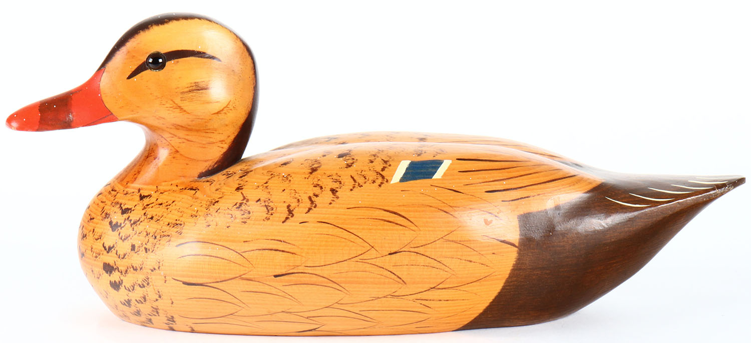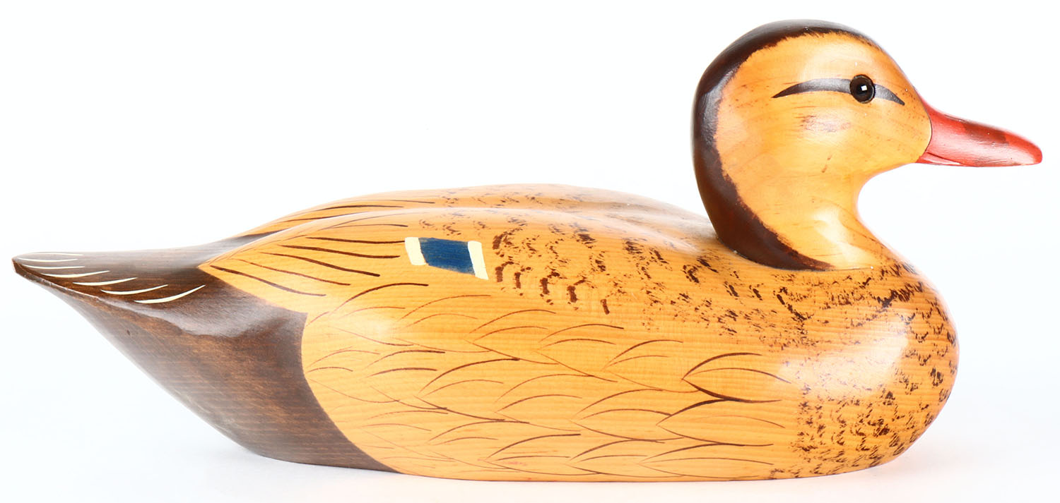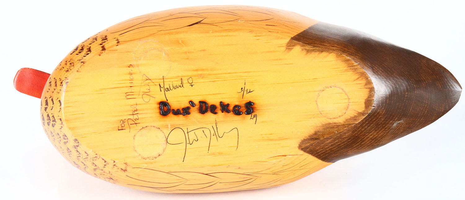 Mallard Hen by Jeff Duxbury of Dux Dekes, NY, Glass eyes, solid wood, original paint, structurally excellent, signed on bottom. Grade: Excellent - Value: 50 to 100