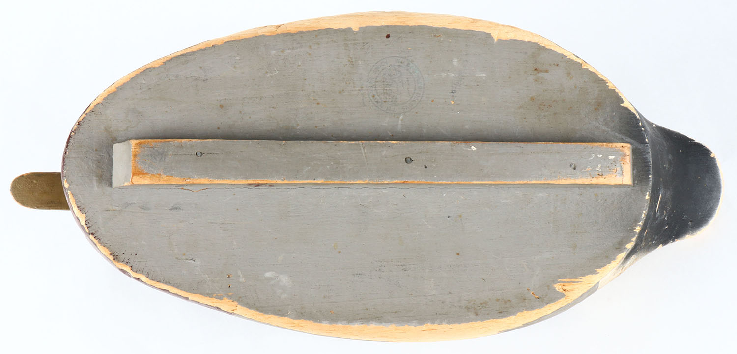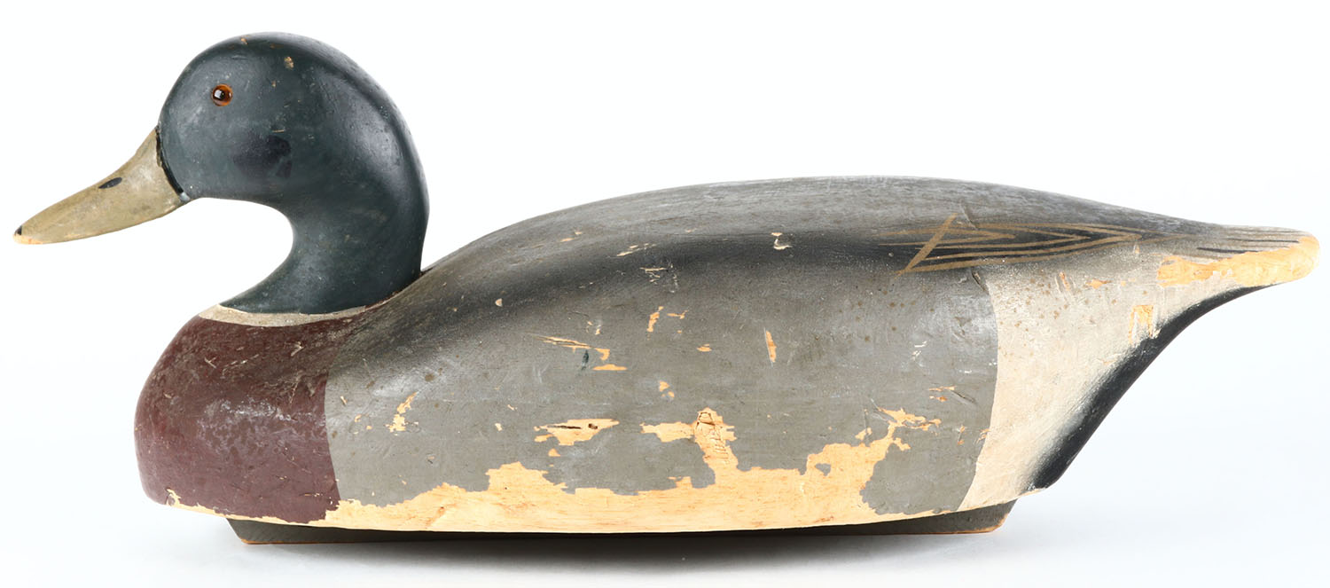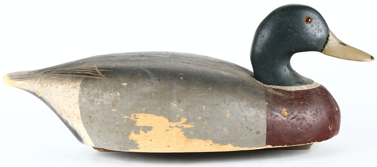 Mallard Drake by Wildfowler Decoy Co., glass eyes, solid balsa wood, original paint, has pellet holes and wear on the paint. Grade: Very Good + - Value: 30 to 60