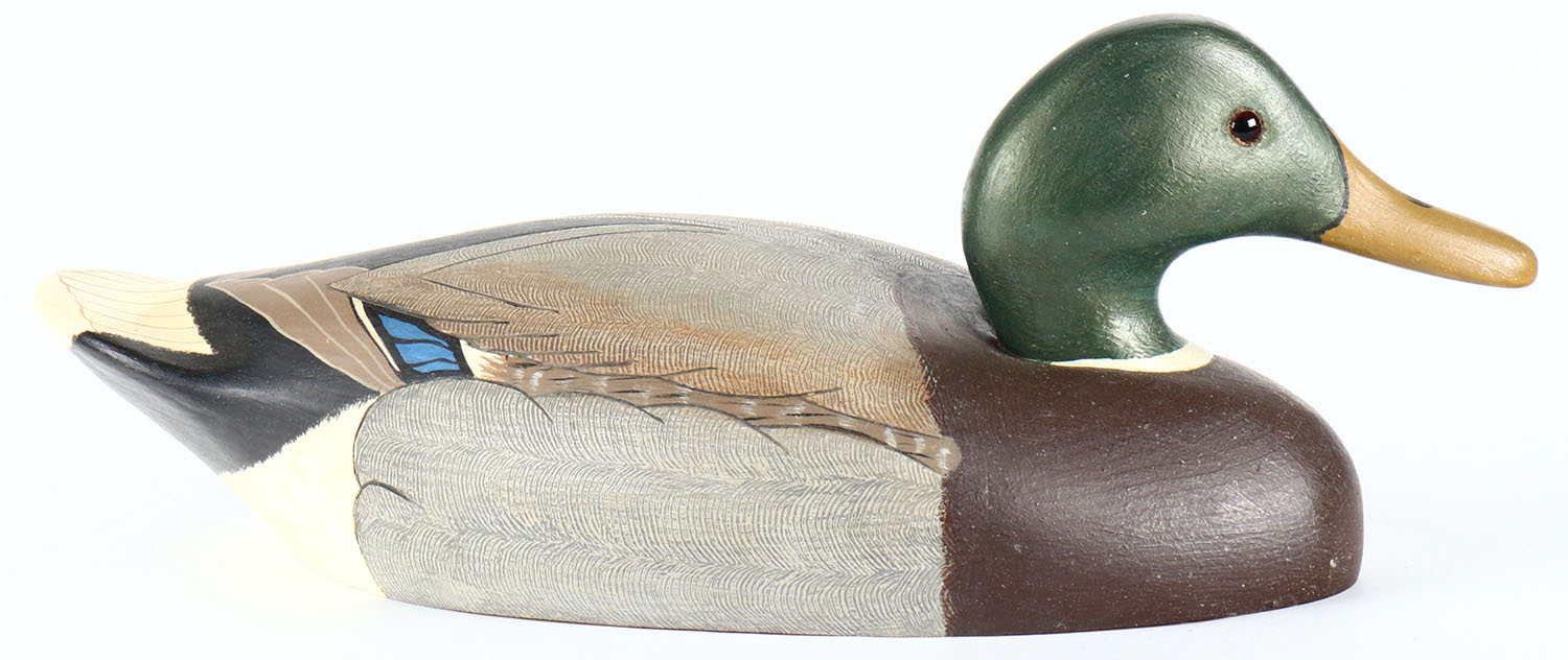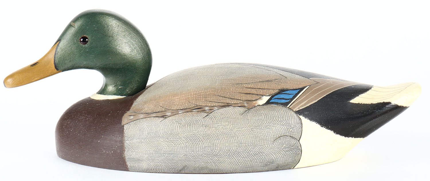 Mallard Drake by Wildfowler Decoys Babylon NY, glass eyes, solid wood, original paint with comb painting, structurally excellent, branded by WILDFOWLER DECOYS on bottom. Grade: Excellent + - Value: 20 to 40