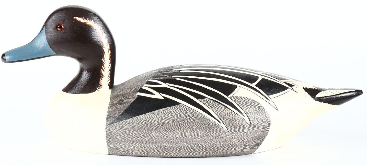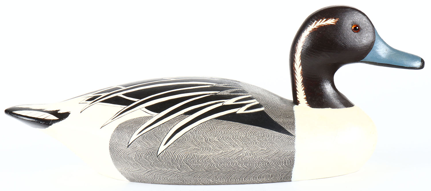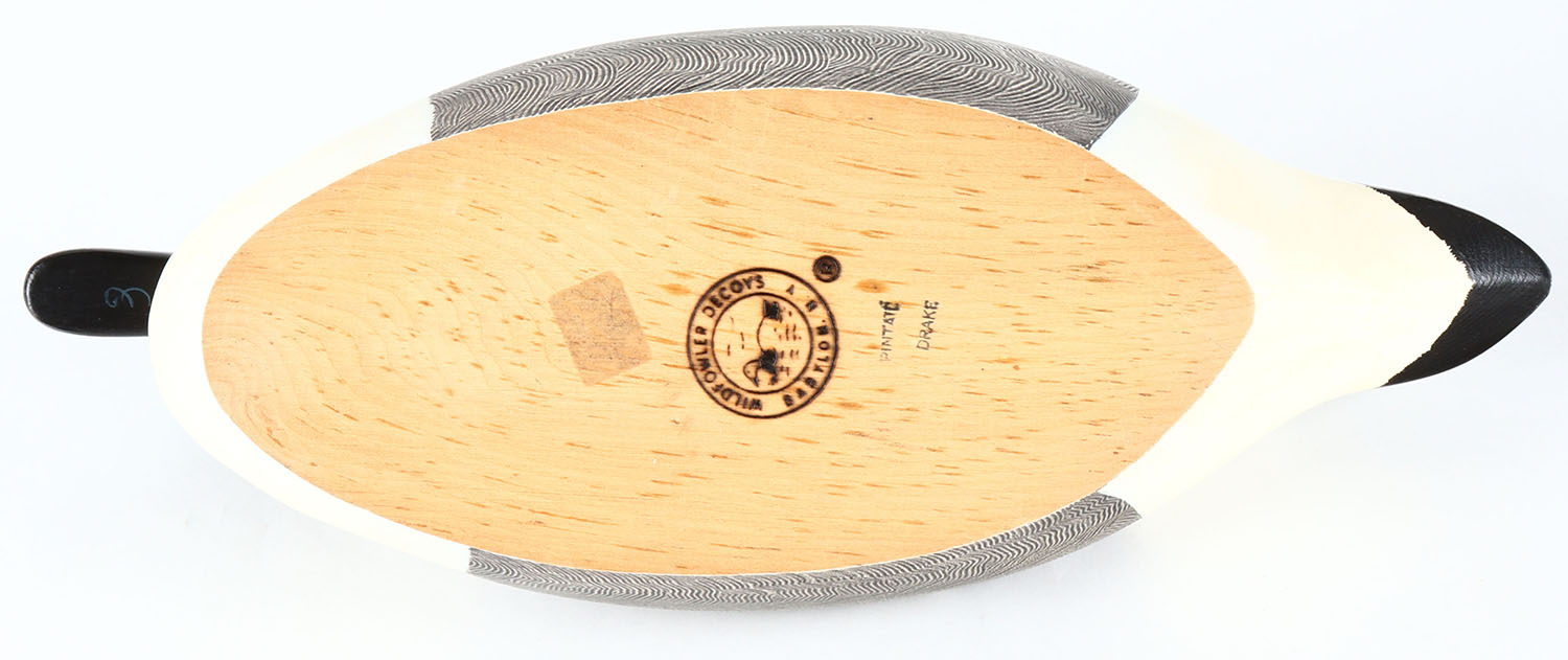 Pintail Drake by Wildfowler Decoys Babylon NY, glass eyes, solid wood, original paint with comb painting, structurally excellent, stamped by WILDFOWLER DECOYS on bottom. Grade: MINT - Value: 50 to 100