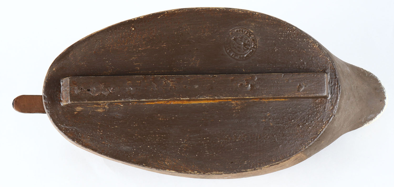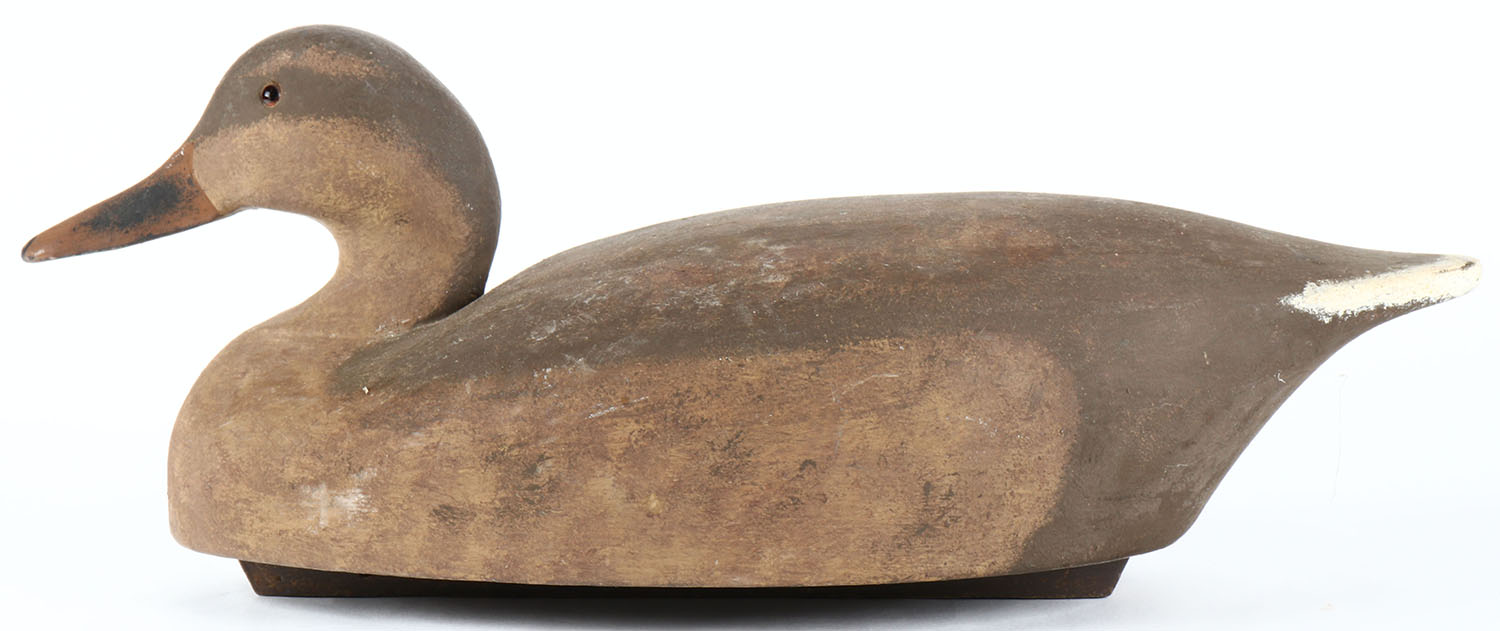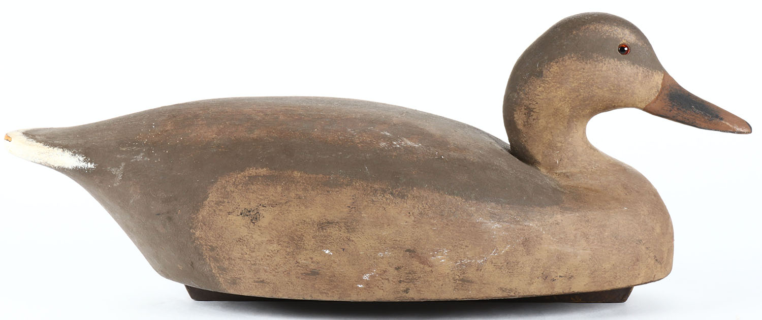 Mallard Hen by Wildfowler Decoys, glass eyes, hollow wood, original paint, structurally excellent, stamped by WILDFOWLER DECOYS on bottom. Grade: Excellent + - Value: 20 to 50