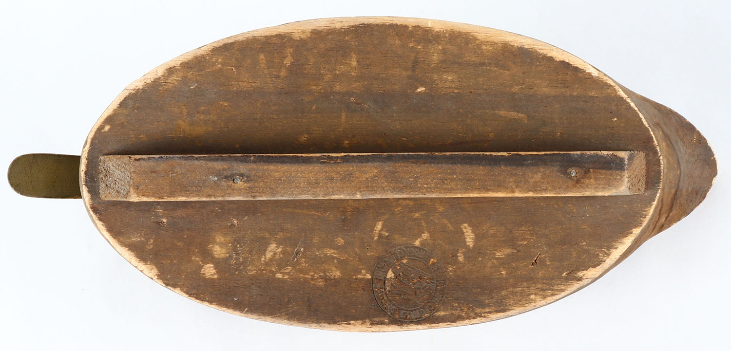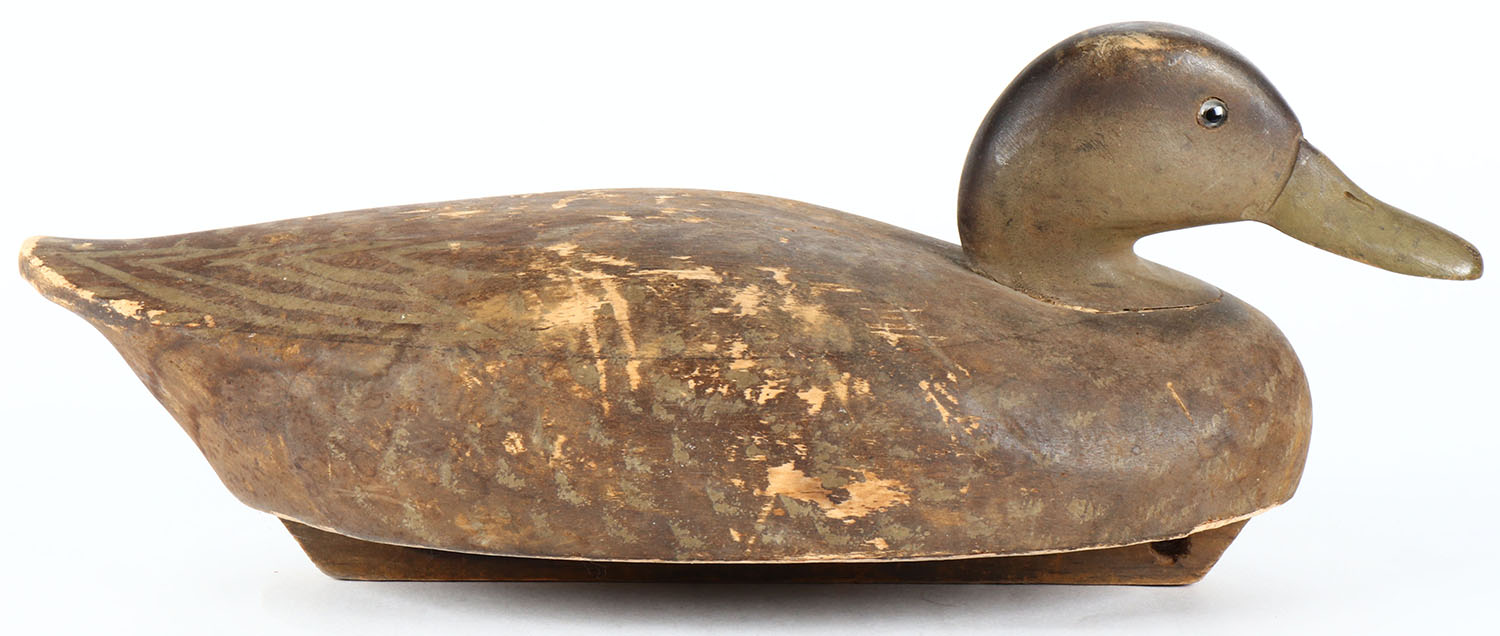 Black Duck by Wildfowler Decoys Old Saybrook, CT, glass eyes, solid balsa wood, original paint, structurally excellent, WILDFOWLER DECOYS brand on bottom. Grade: Very Good